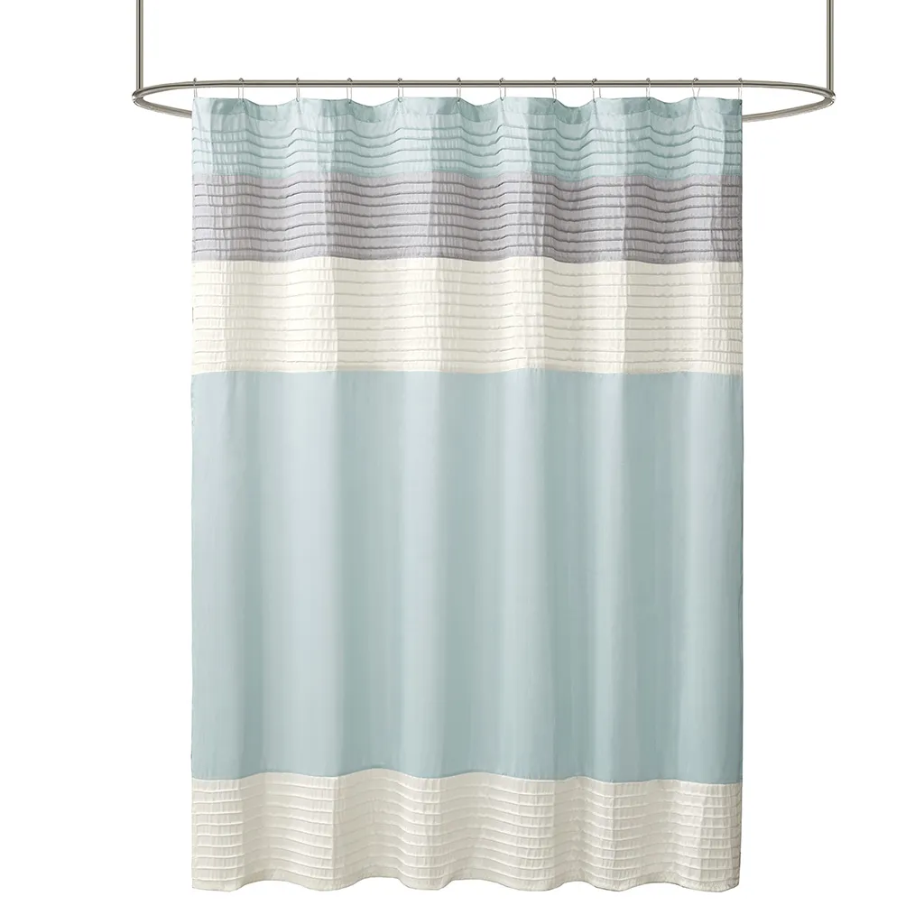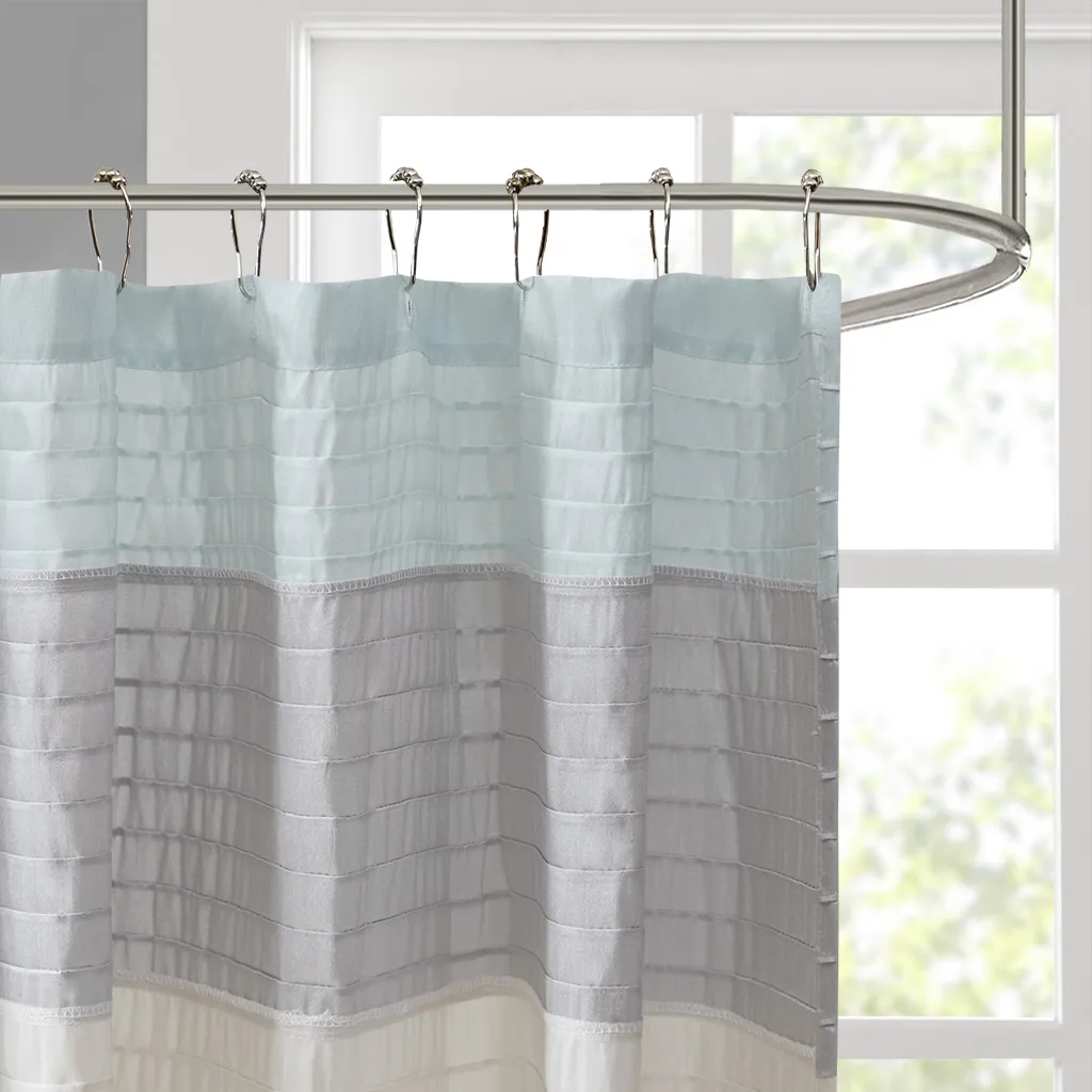 Easily transition your bathroom with this simple, yet beautifully classic shower curtain. The faux silk dupioni fabric has a natural light sheen and drapes beautifully, while also machine washable for easy care. This lightweight shower curtain features pieced and pintucking details creating a rich texture and a unique color block design, sure to freshen up any space. Pattern layout may vary due to variation of sizes. A water repellant liner is not included, and highly recommended. Complete the collection and look with coordinate bath decor, bedding, and window decor - available and sold separately.