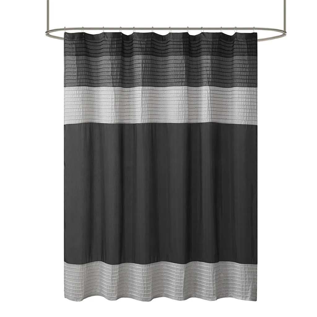 Easily transition your bathroom with this simple, yet beautifully classic shower curtain. The faux silk dupioni fabric has a natural light sheen and drapes beautifully, while also machine washable for easy care. This lightweight shower curtain features pieced and pintucking details creating a rich texture and a unique color block design, sure to freshen up any space. Pattern layout may vary due to variation of sizes. A water repellant liner is not included, and highly recommended. Complete the collection and look with coordinate bath decor, bedding, and window decor - available and sold separately.