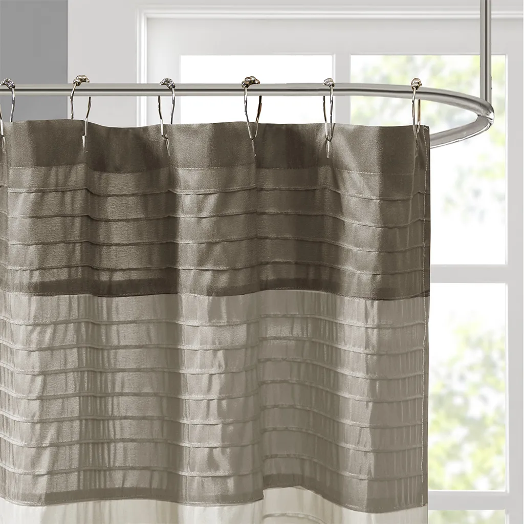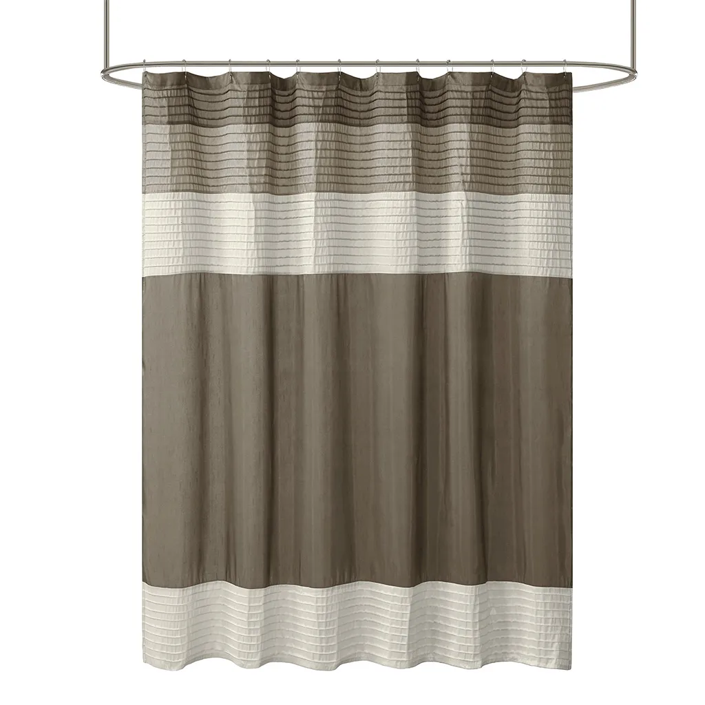 Easily transition your bathroom with this simple, yet beautifully classic shower curtain. The faux silk dupioni fabric has a natural light sheen and drapes beautifully, while also machine washable for easy care. This lightweight shower curtain features pieced and pintucking details creating a rich texture and a unique color block design, sure to freshen up any space. Pattern layout may vary due to variation of sizes. A water repellant liner is not included, and highly recommended. Complete the collection and look with coordinate bath decor, bedding, and window decor - available and sold separately.