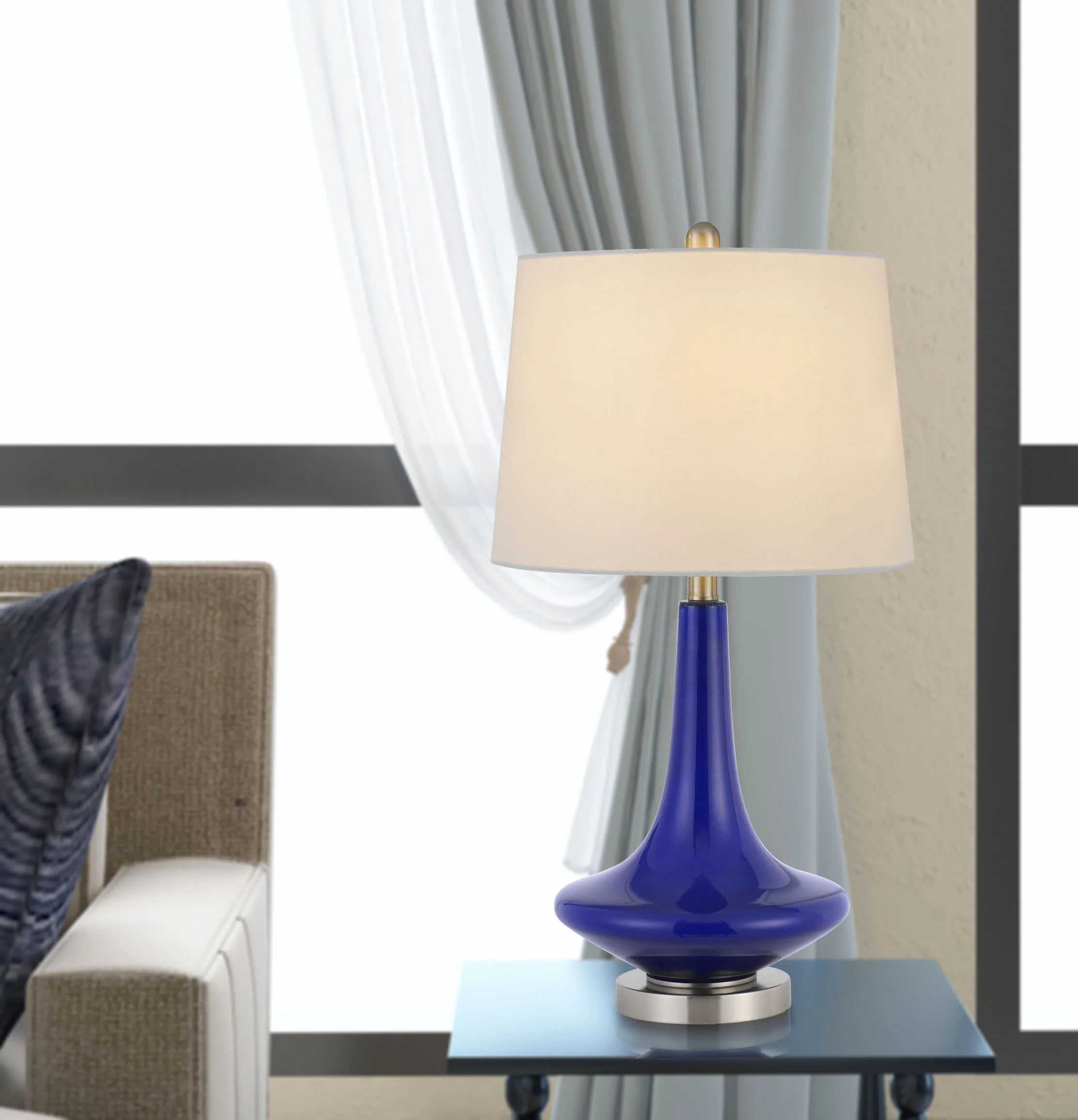 100w Kleve Glass Table Lamp With Taper Drum Hardback Linen Shade(Priced And Sold As Pairs)