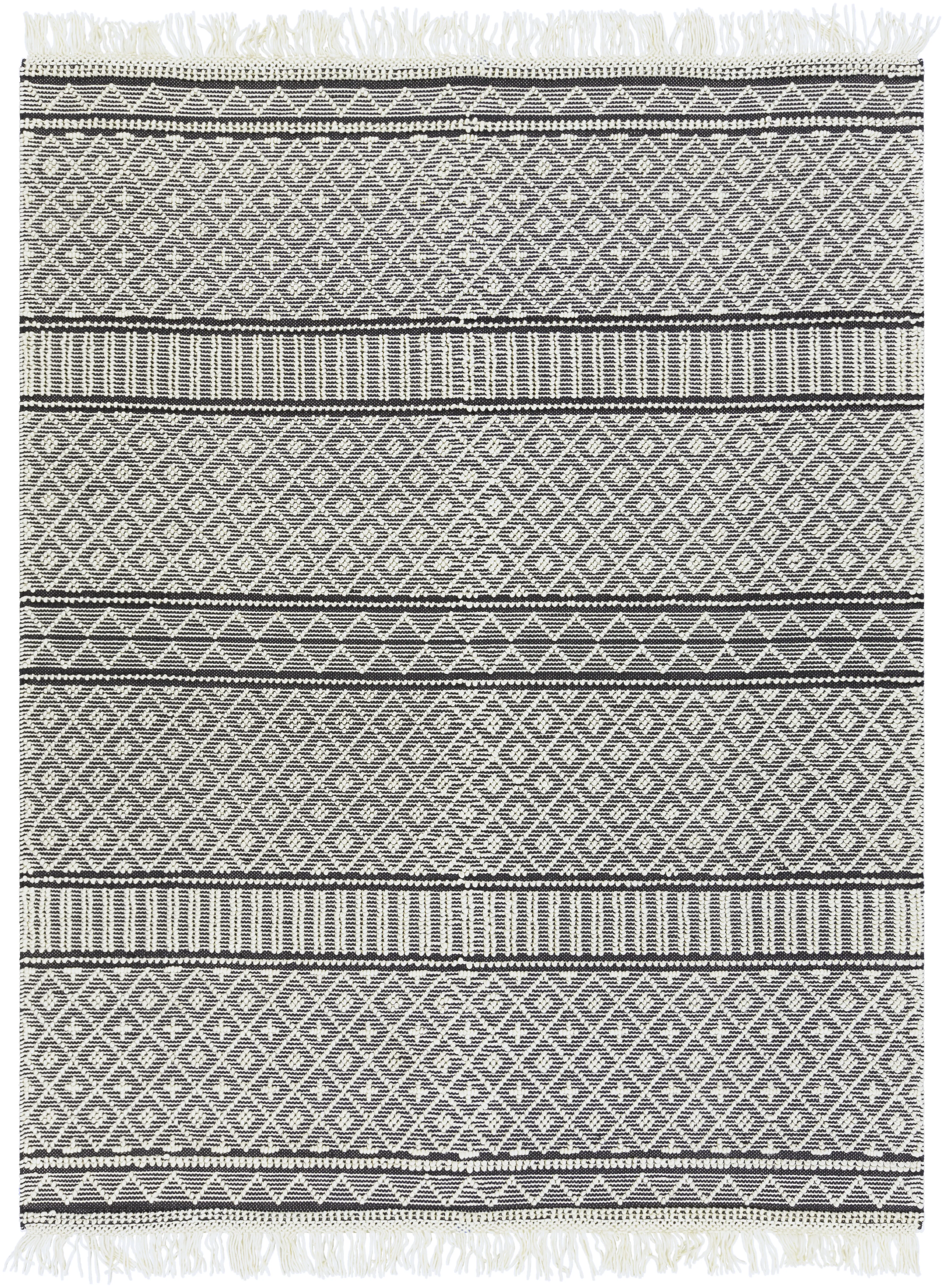 Our rugs from the Farmhouse Tassels Collection feature striking global inspired designs that endure at the forefront of contemporary trends. The meticulously woven construction of these pieces boasts durability and will provide natural charm into your decor space. Made with Wool, Cotton in India, and has No Pile. Spot Clean Only, One Year Limited Warranty.