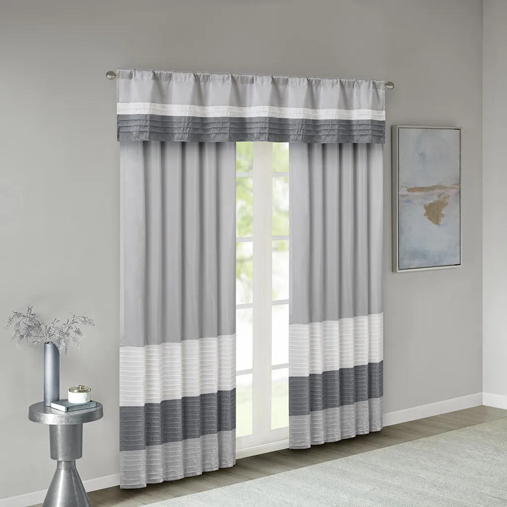 Amherst's modern color block design is a simple way to add style to your room. This window panel features color block stripes in neutral hues of grey and ivory, combined with pintuck detailing for beautiful texture and dimension. Added lining helps to filter the perfect amount of light and creates a fuller look. Hang using the rod pocket or back tabs for a tailored look. Fits up to 1.25" diameter rod.