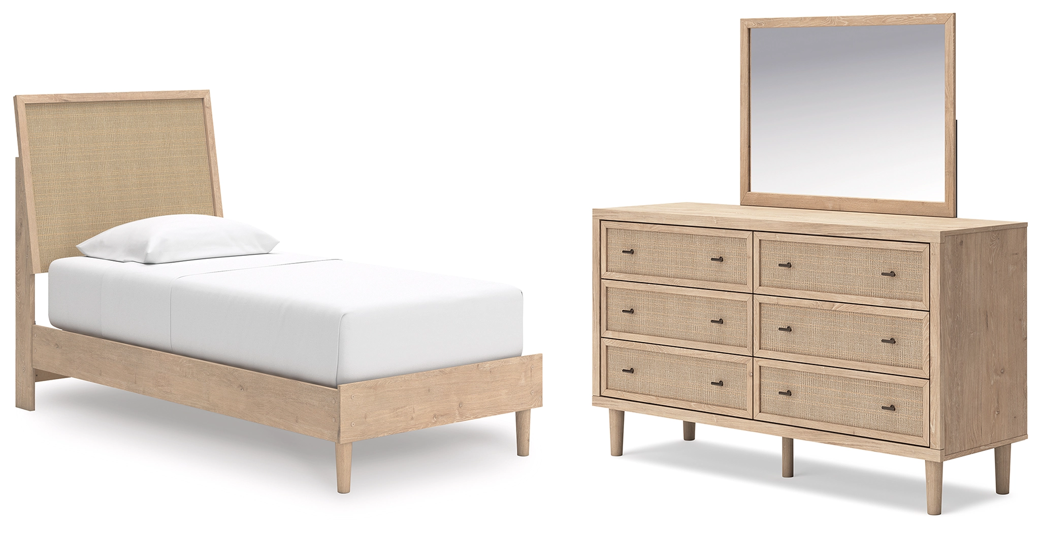 Clean-lined and contemporary—but far from stark—this bedroom package is a fresh style awakening. Pairing a light finish with replicated oak grain and textured beige details that replicate the look of cane, its mixed materials bring a naturally versatile vibe to your bedroom. Sleek, simple hardware plays perfectly with the modern aesthetic.