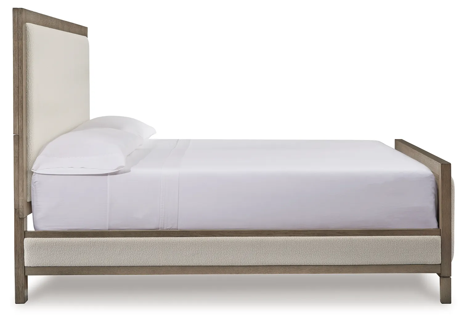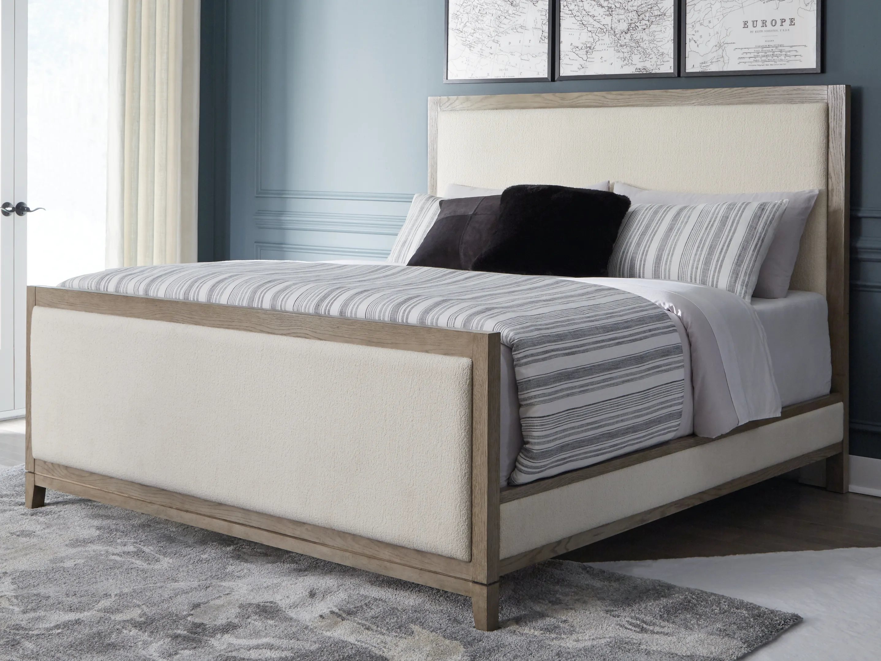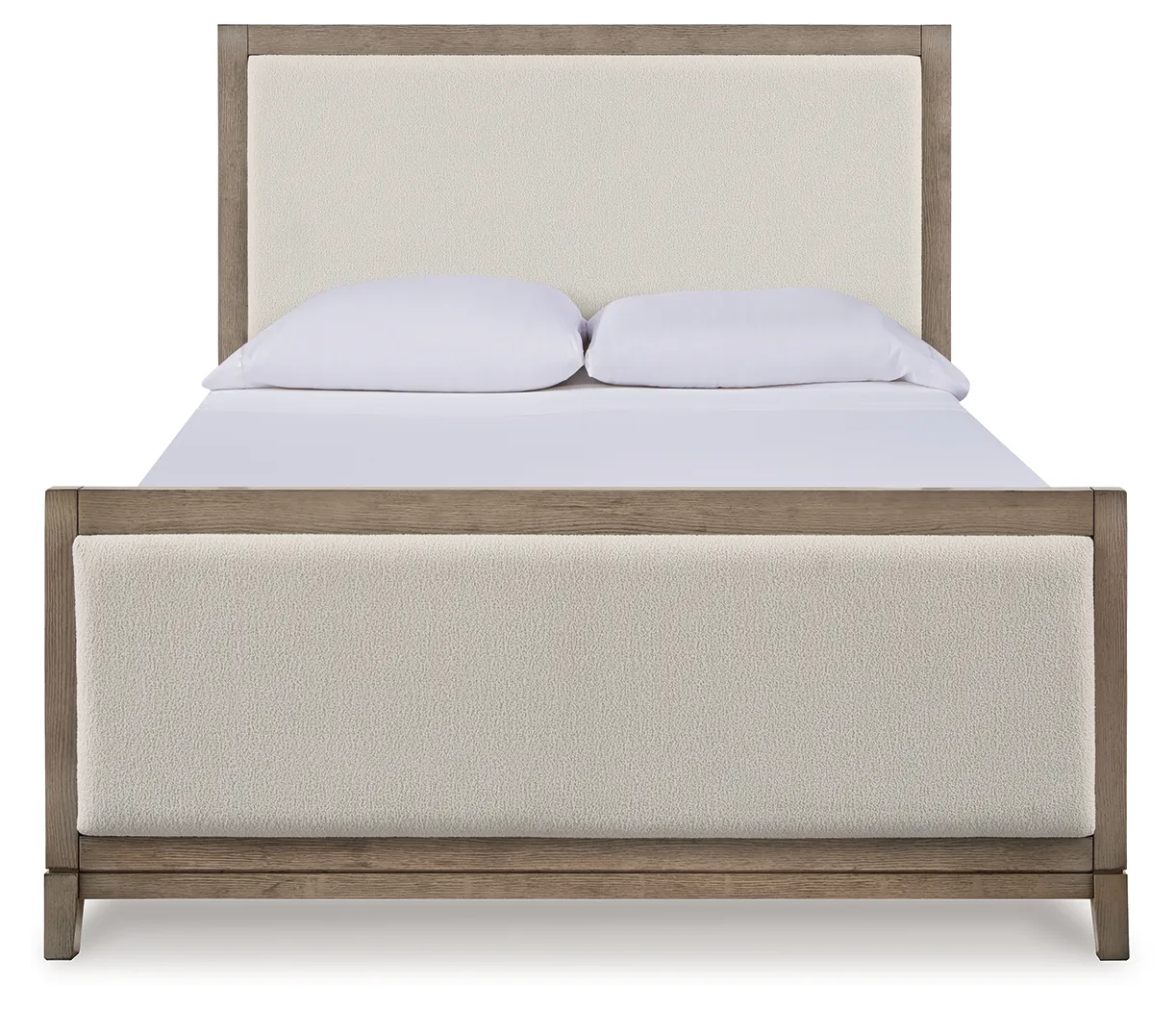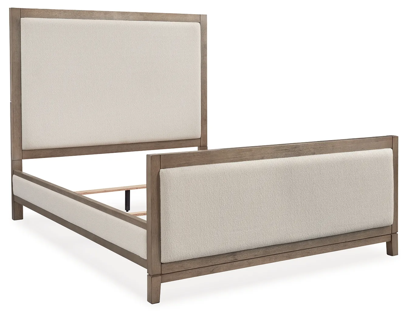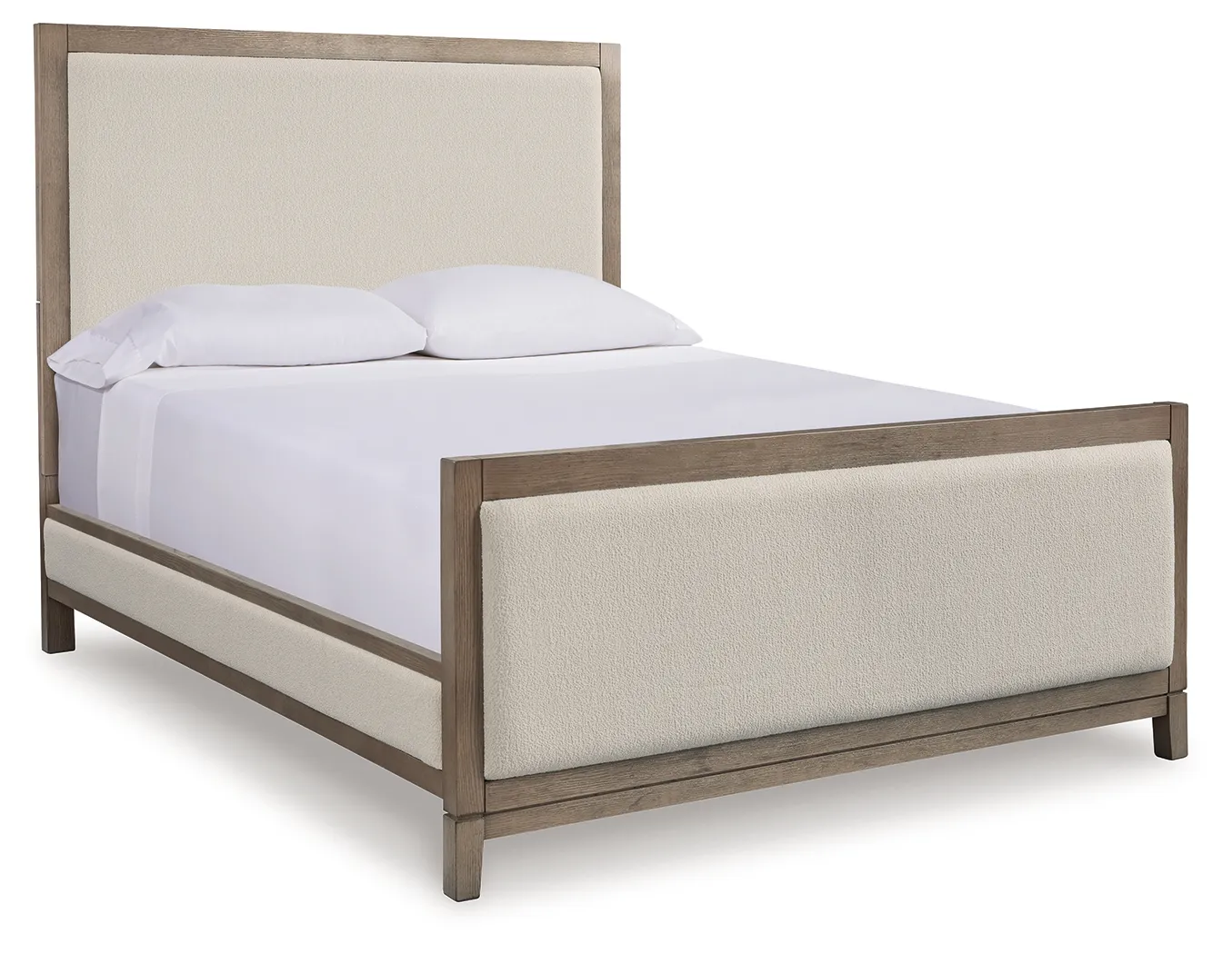• Includes queen upholstered panel headboard, footboard and rails