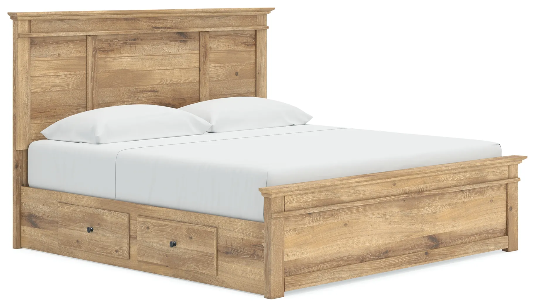 Looking to create a bedroom that feels airy and beautifully put together? This casually comfy king panel storage bed is your perfect solution. Its clean lines, replicated oak grain and on-trend natural finish exude a charming cottage-inspired feel that brightens your restful retreat. Spacious drawers with dark bronze-tone knobs stow away clothes and more. Now there’s a fresh take on country living we can get behind.
