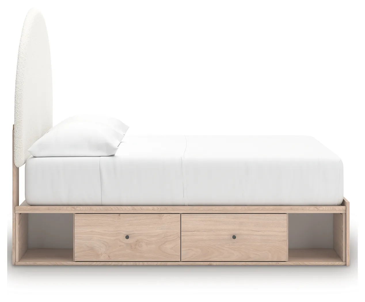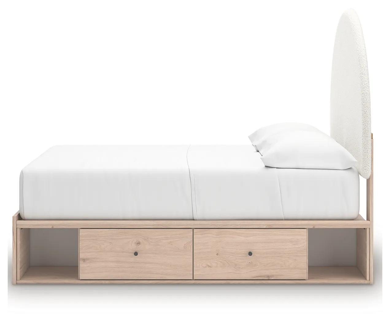Includes upholstered panel headboard, panel footboard, roll slats and 2 under bed storage units