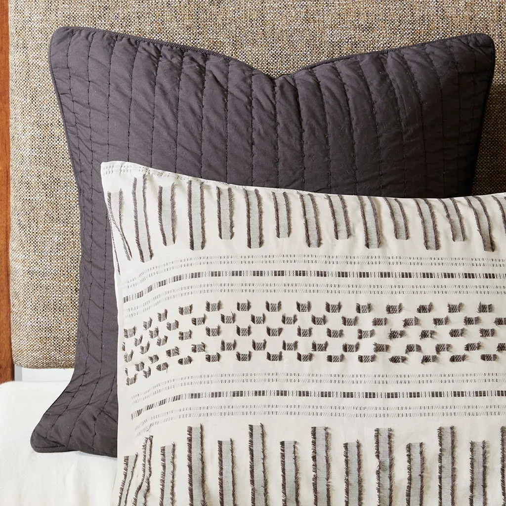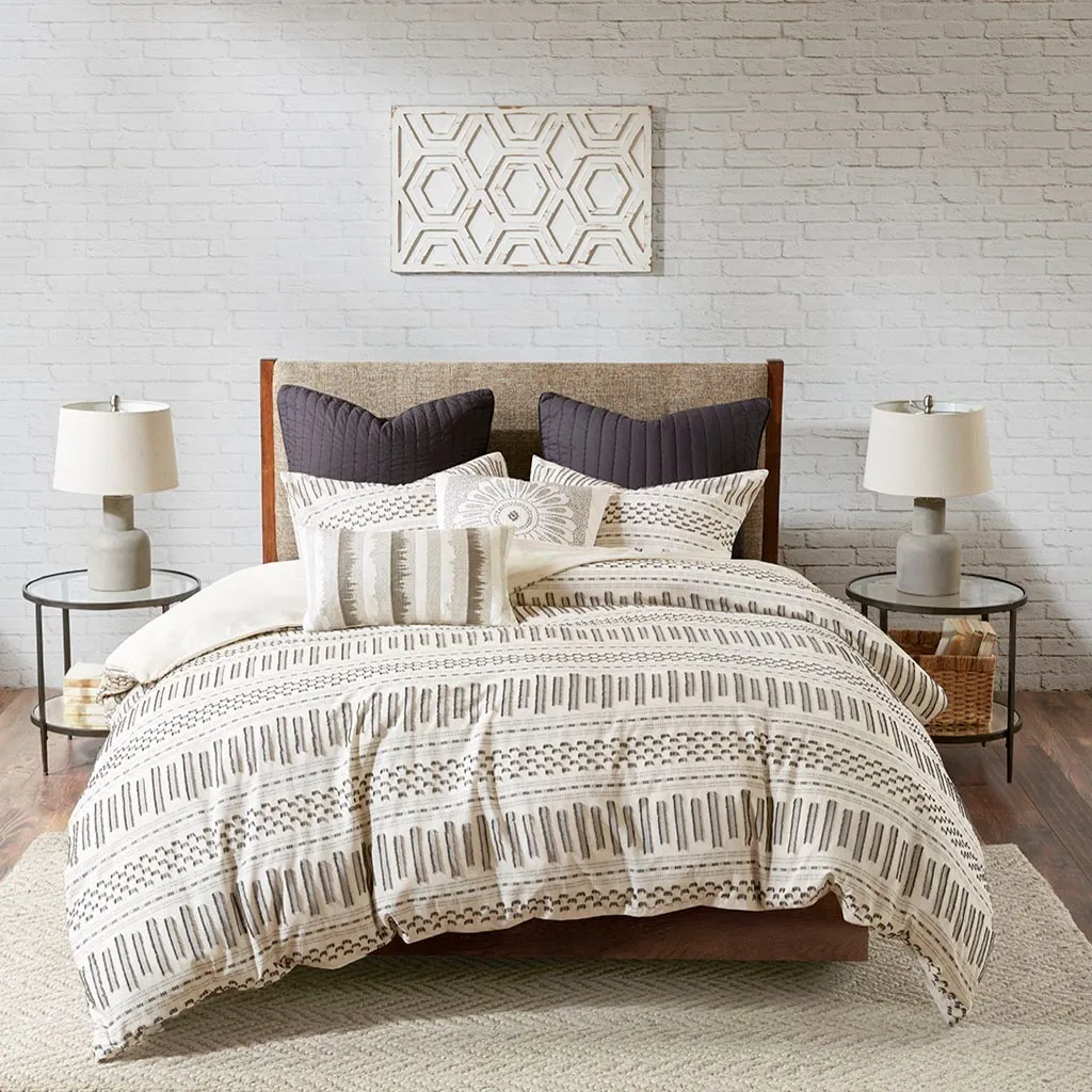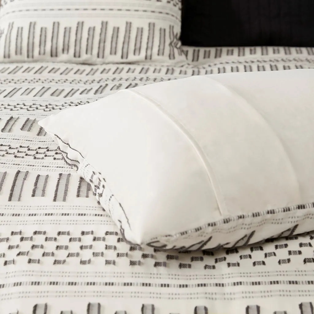 Give your bedroom a comfortable farmhouse look with INK+IVY's Rhea Cotton Jacquard Comforter Mini Set. The ivory cotton comforter features horizontal stripes, in charcoal hues, with eyelash-looking woven details that add a charming accent to the top of the bed. Hidden bartacks create a clean, duvet-like finish on the comforter, while matching shams mimic the design seen on top of the bed completing the cotton jacquard bedding set. Made from 100% cotton, this jacquard comforter set is machine washable for easy care and provides a causal allure for your bedroom décor.