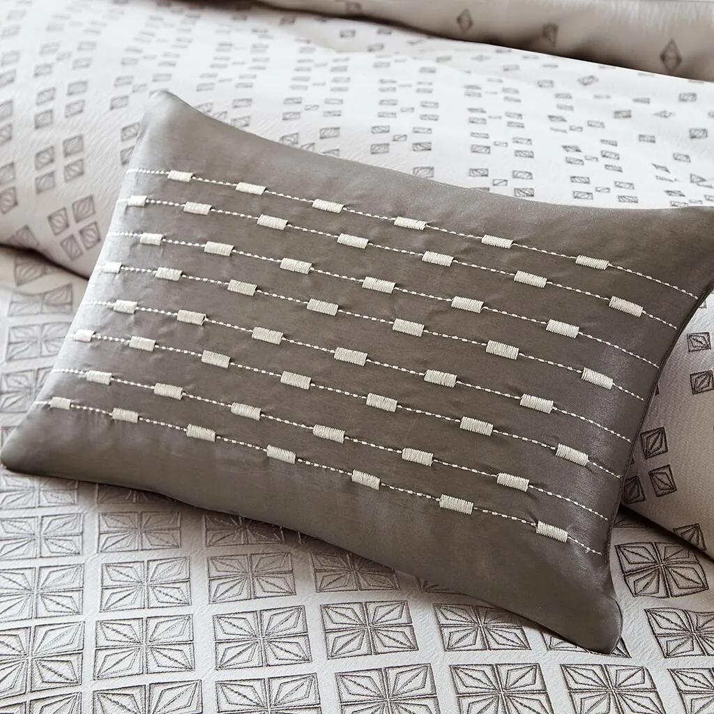 To update your space to a modern look, try the Madison Park Biloxi Collection. Made from polyester jacquard, this unique design is woven to look like sequins. The design has an ombre affect looking heavy in the center of the bed and spreading out towards the top and bottom of the comforter. Two matching shams share this ombre design. Three decorative pillows use unique embroidery and fabric manipulation for the perfect new look for your space.