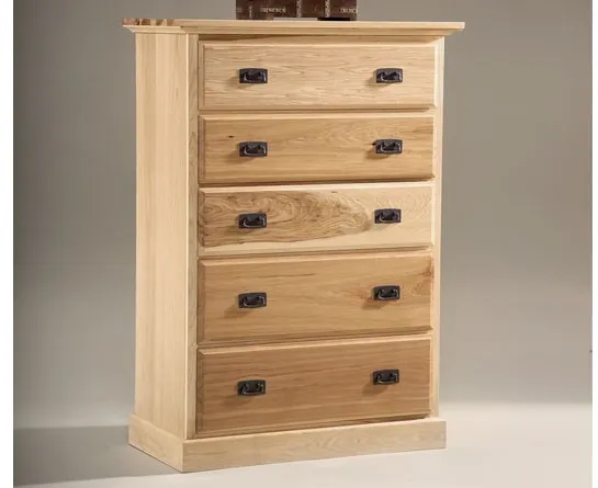 Amish Highlands is inspired by the natural rustic charm of the classic Amish styled funiture, this classic collection has clean simple lines and a sophisticated feel. The value of American Hickory is not only in its strength and durability, but also in its unique color and rich grain variations. The dark streaks range from a blonde hue to dark brown that emphasizes hickory's natural beauty. Hickory is a high density wood that is extremely resilient to surface damages and is as smooth as glass. Guaranteed to become tomorrow's heirlooms. The 5 drawer Hickory chest is crafted with solid drawer fronts, English dovetail construction and full extension king metal ball bearing glides. The dark disressed metal handles add style and sophistication to every room. MATERIAL: Solid Hickory