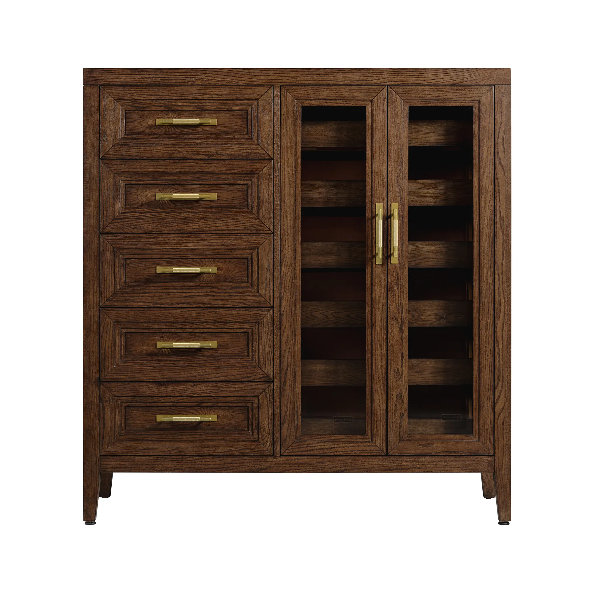 - 5 drawers; 2 glass doors