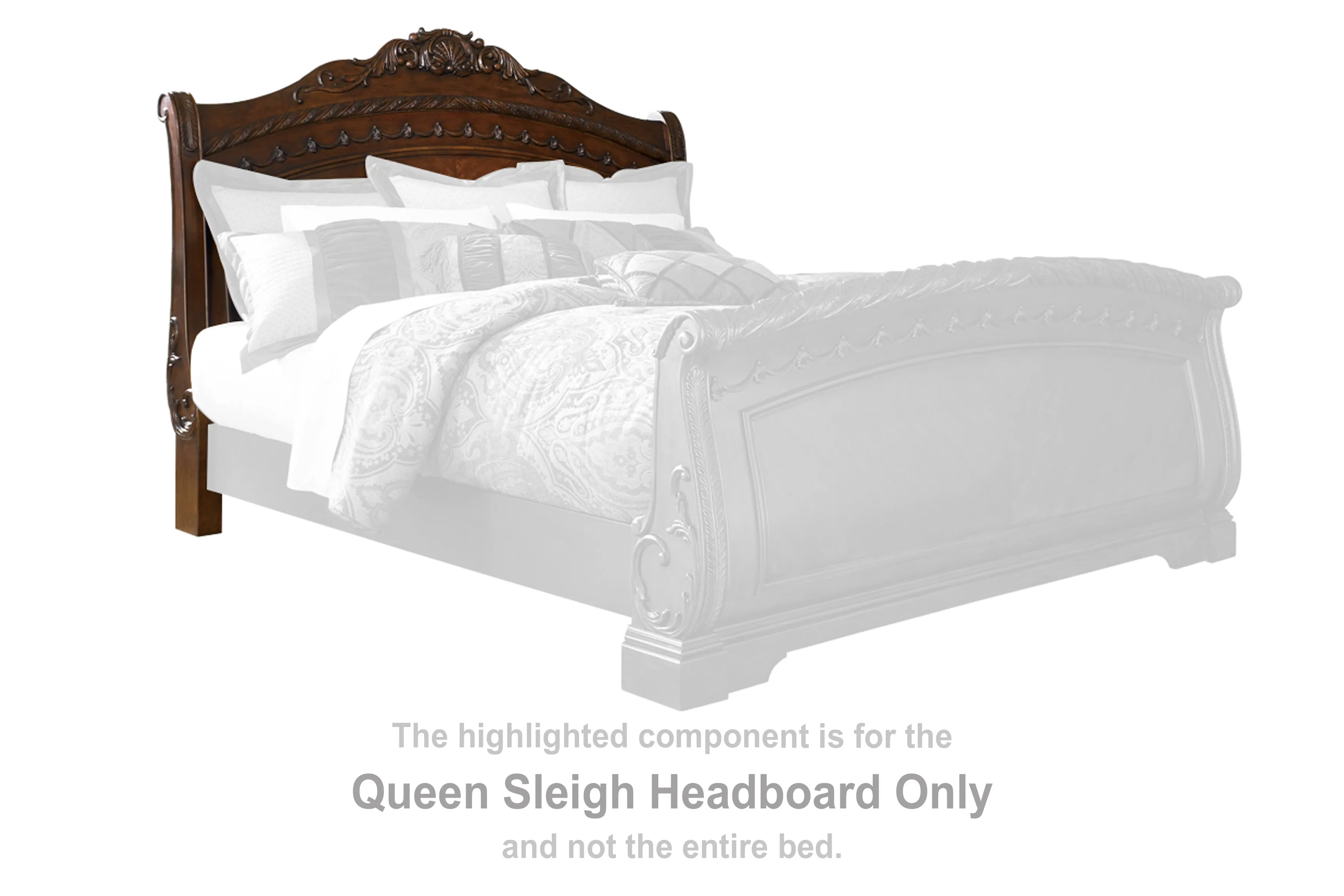 Inspired by the grandeur and grace of Old World traditional style, this queen sleigh headboard is nothing short of stunning. A choice blend of materials is accented by detailed ornamental appliques. Graceful curves of the sleigh design are the essence of romance.