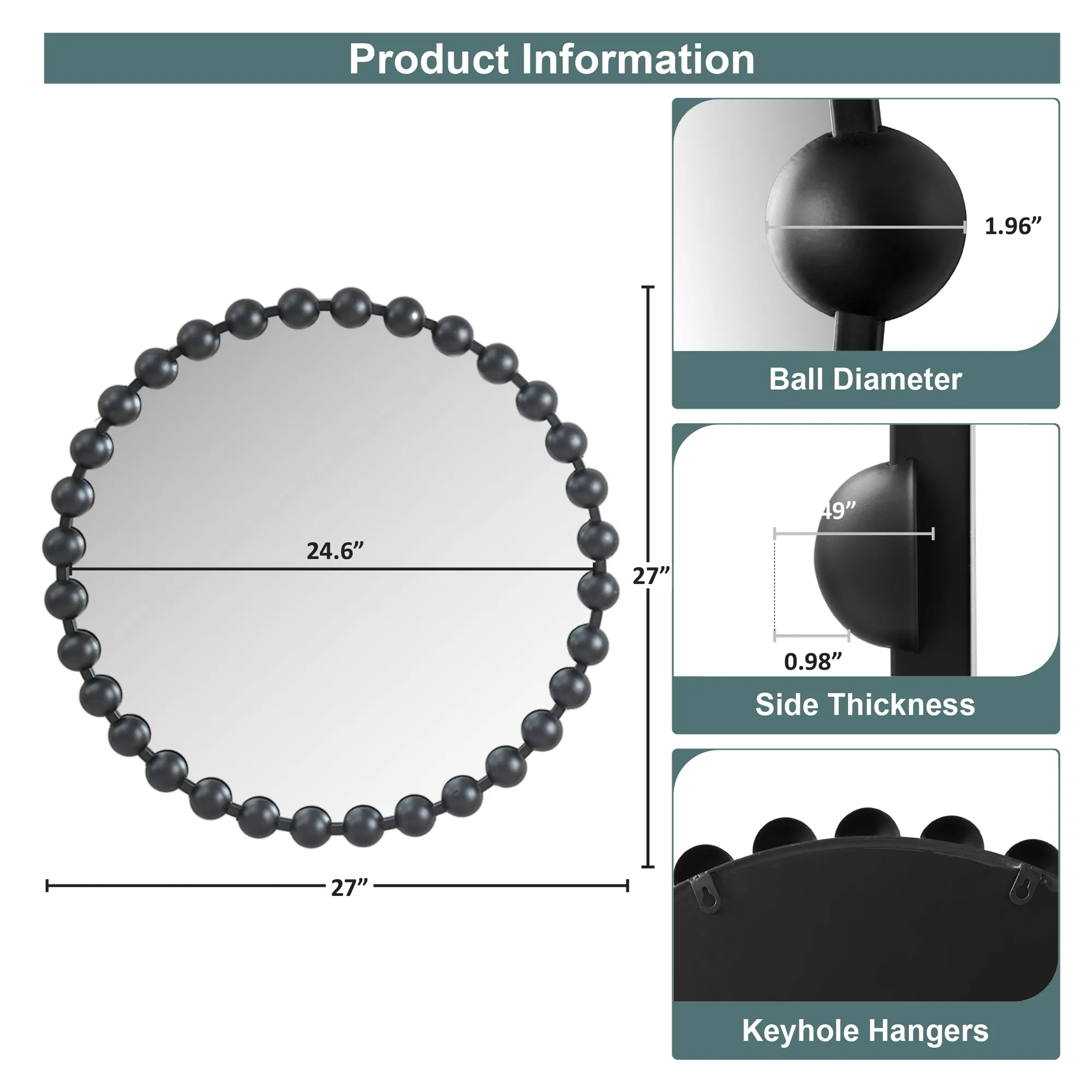Elevate your decor with the Madison Park Signature Marlowe 27" Round Black Wall Mirror. This stunning mirror features a vintage-inspired beaded frame with a sleek matte black finish, adding contemporary luxury to any room. Crafted with high-definition glass for a clear, distortion-free reflection, it comes ready to hang with pre-installed hangers. This medium-sized mirror is perfect for making a statement in small spaces, from the vanity to the living room, bedroom, or entryway. Shop now to bring modern elegance to your home.