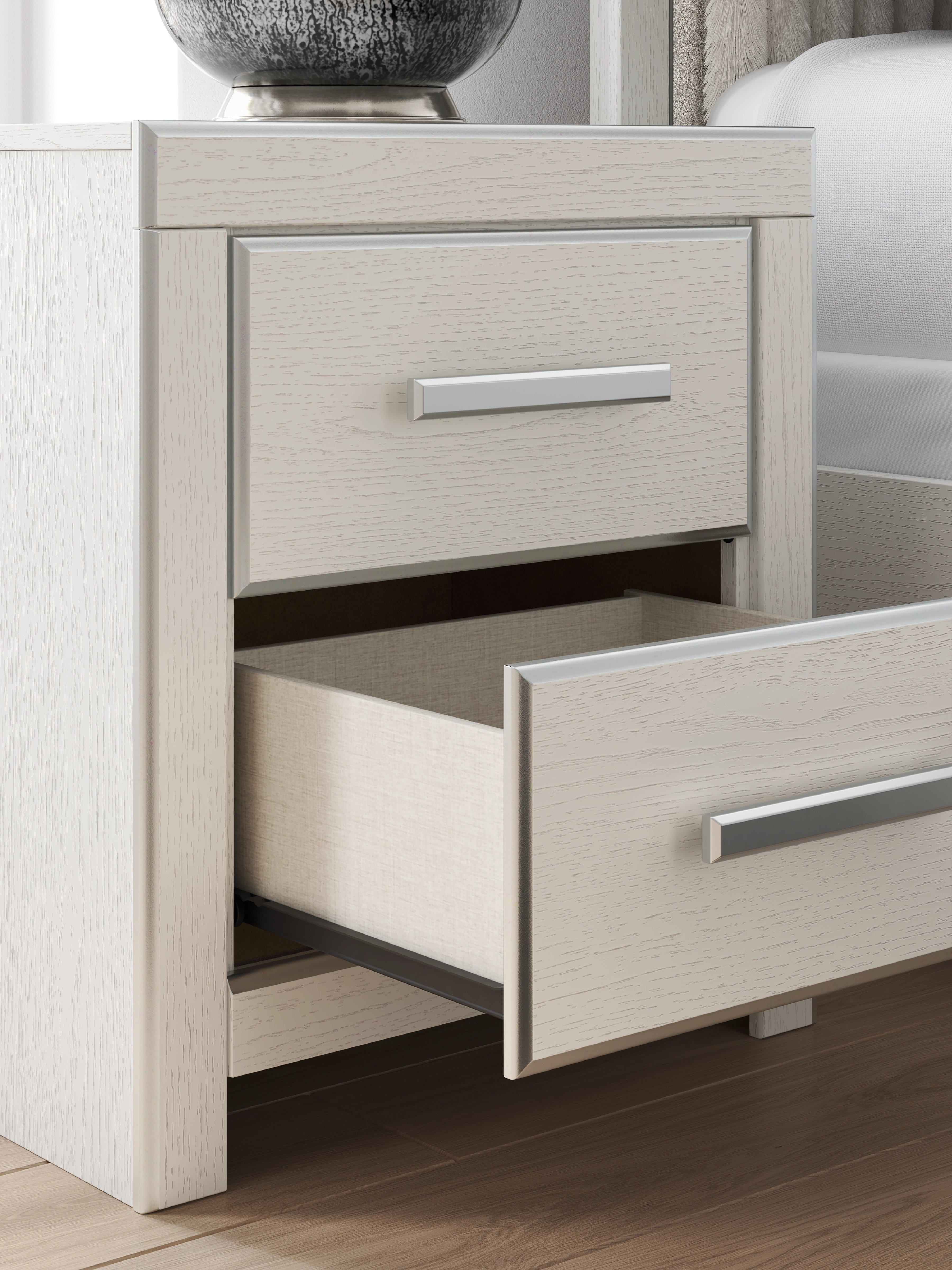 If glitz and glam are your jam, you’re gonna love the Birmonton nightstand. Large-scale handles and dazzling chrome-tone details add a pop of stunning pizzazz against a sophisticated matte white finish. USB charging keeps you connected, and the spacious storage drawers don’t disappoint. Loaded with serious sparkle, it's a simply splendid way to wake up your inner sanctum’s style.