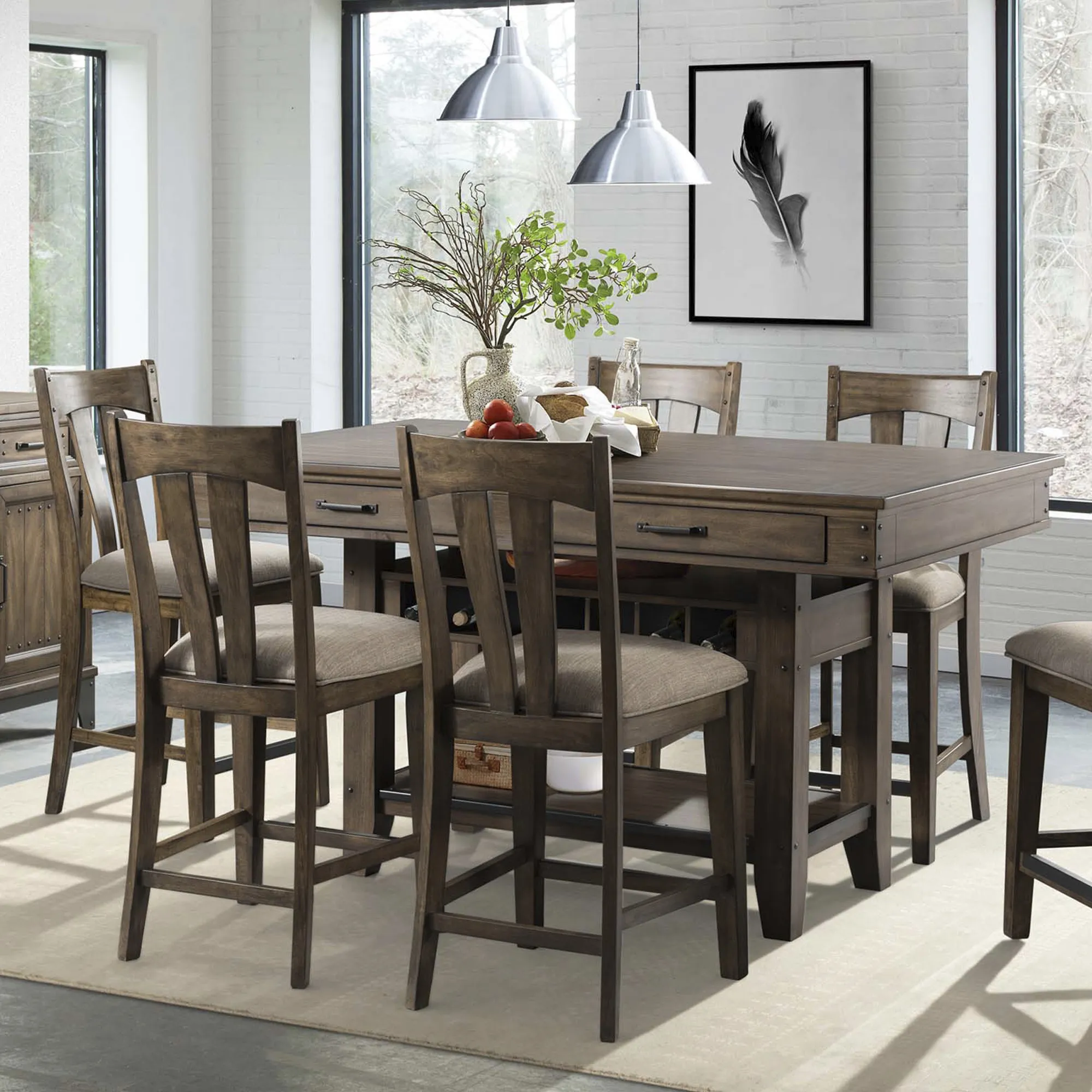 The Whiskey River Dining collection consists of two sizes of tables with matching counter stool and side chair and a charming sideboard. Also available in home theater pieces.