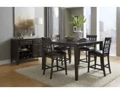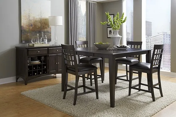 Perfect style for today's customer who prefer solid wood and appreciates a beautiful transitional contemporary look with a rich warm gray finish with brown undertones. This gather height leg table features 1-18" self storing butterfly leaf to easily expand for larger parties.