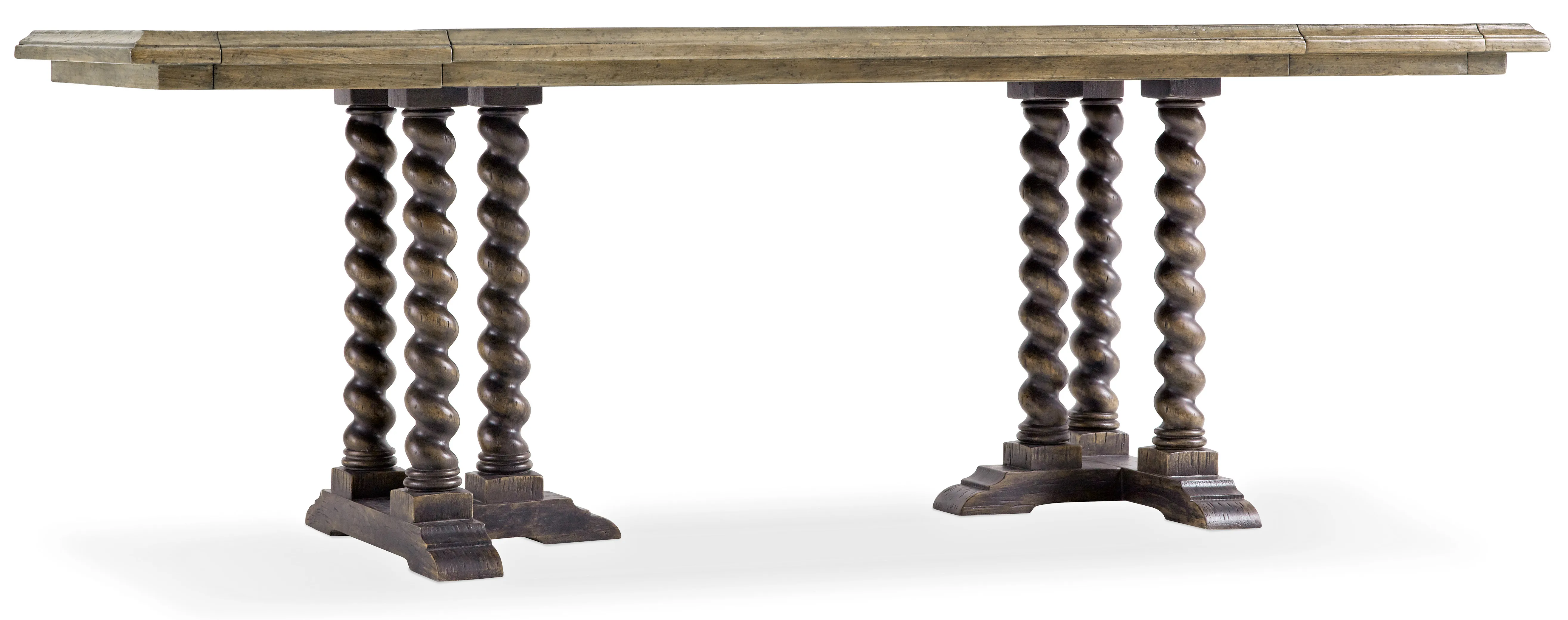 Inspired by inns on the Western frontier where travelers gathered around tables for meals and were transformed from strangers to friends, the La Grange Friendship Table is distinguished by barley twist legs finished in a rich, dark Antique Varnish. The table top has a reclaimed wood character, finished in Barnwood, a multi-tone brown. The magic of this table is that you have a choice: you can use it at dining height, or raise it to counter height. Two 12-inch leaves extend the table to 84 inches long, accommodating six side chairs or counter-height chairs with both leaves in place.
