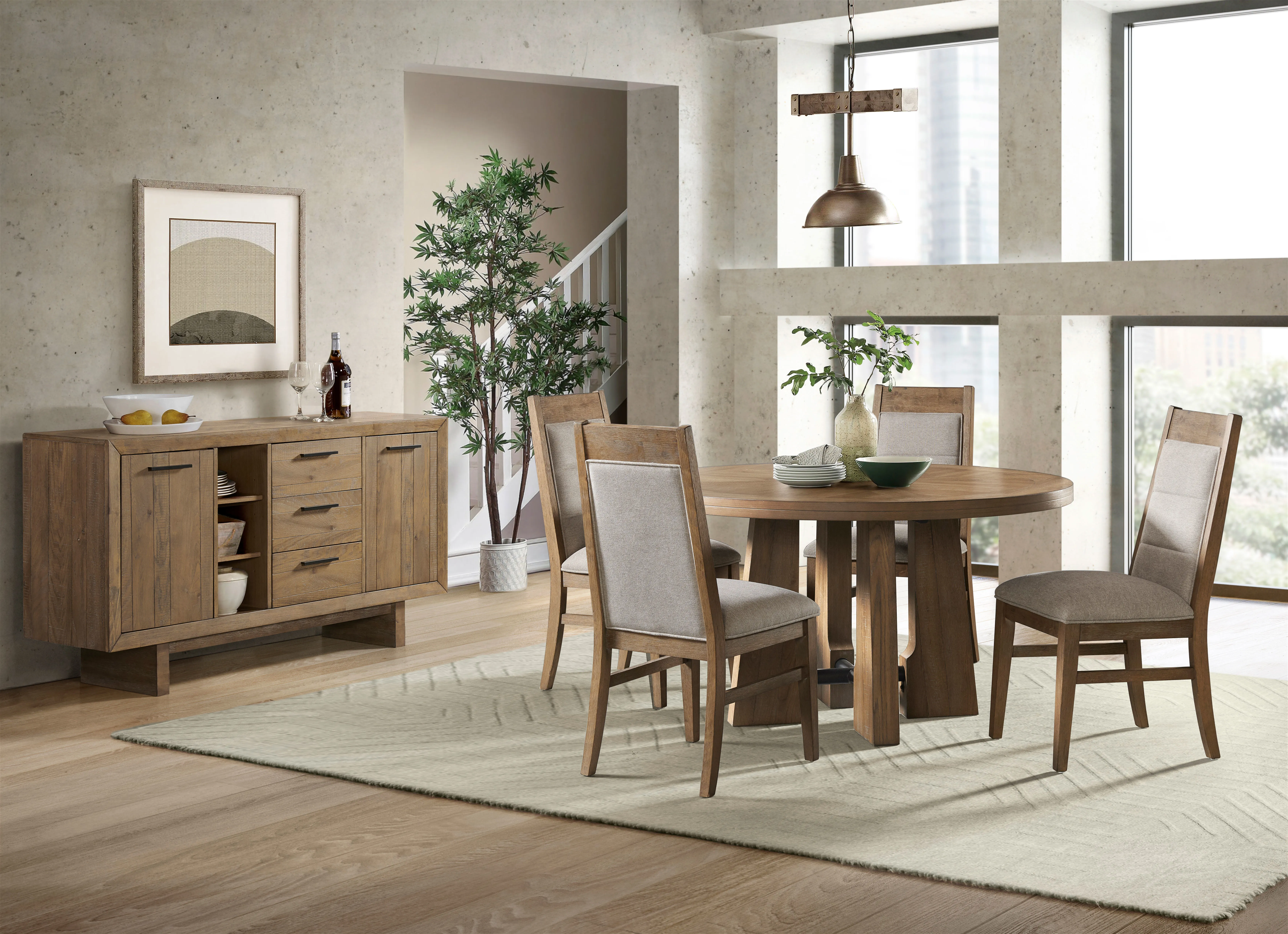 The Landmark Dining Collection has beautifully veneered table tops that feature a very unique sunburst pattern. The light saw mark accents and weathered oak finish gives this sleek modern collection a classic rustic feel.