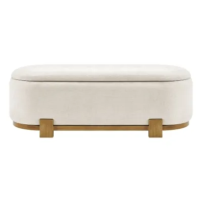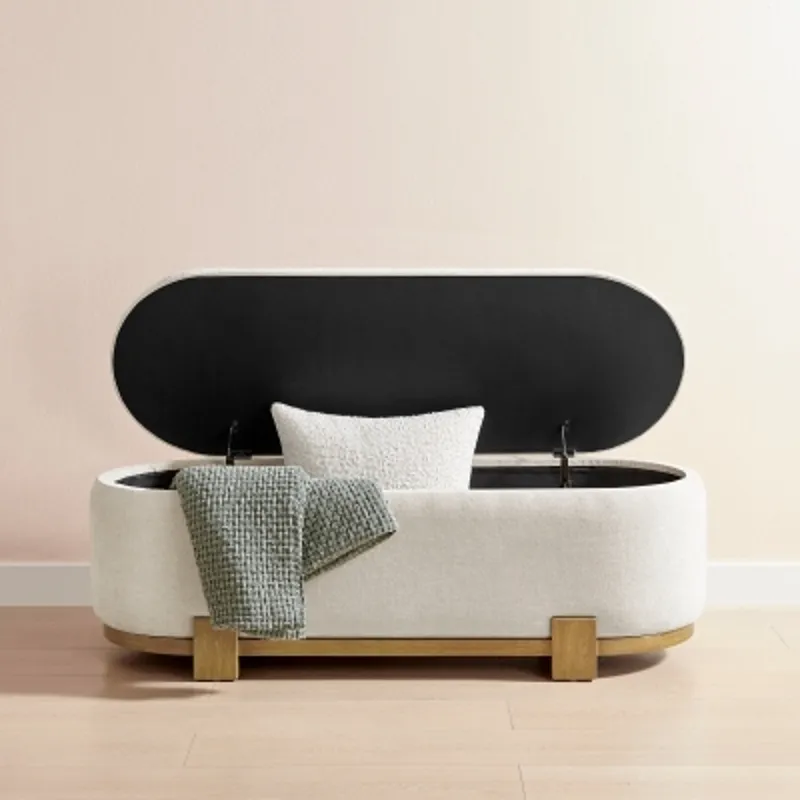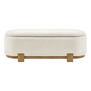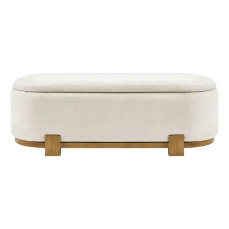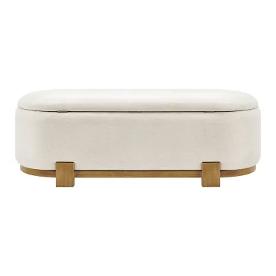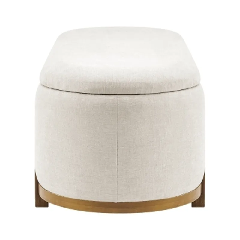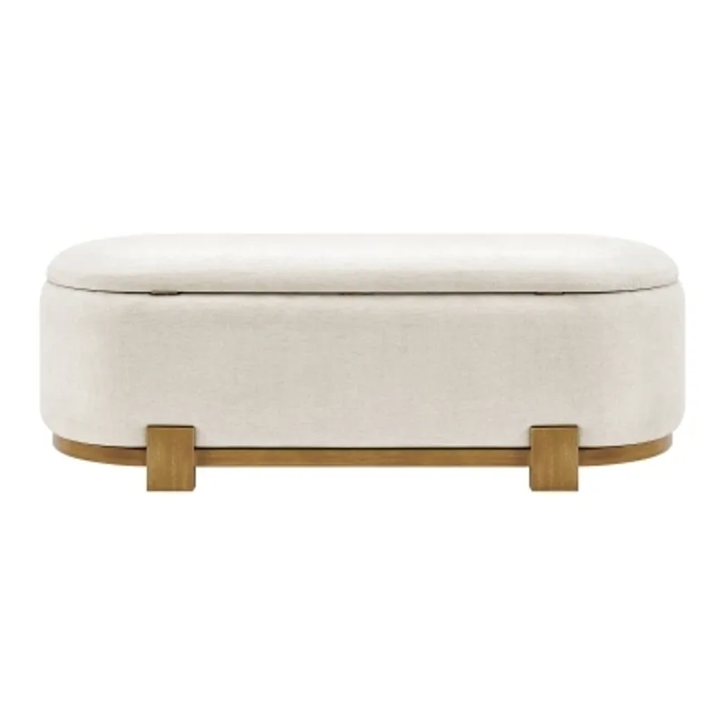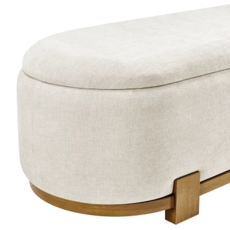 Bring a blend of style and function to the interior with the Ayleen storage bench. Its softly rounded silhouette, wrapped in easy-care chenille, offers a cozy touch, while the hidden storage keeps your spaces effortlessly tidy. Perfect for the foyer, bedroom, or living room, it's a clutter-busting piece with modern flair. The wood-tone base adds a hint of warmth, grounding the contemporary design. Fully assembled. Available in Seneca Beige and Seneca Green. For modern chic fans, elevate your space with an accent bench featuring a sleek curved profile and posh chenille fabric. The top cushions opens with hinged lids to reveal generous storage. A chestnut-tone solid wood frame base adds an elegant contrast, blending style with function. Plastic glides ensure the floors stay protected.