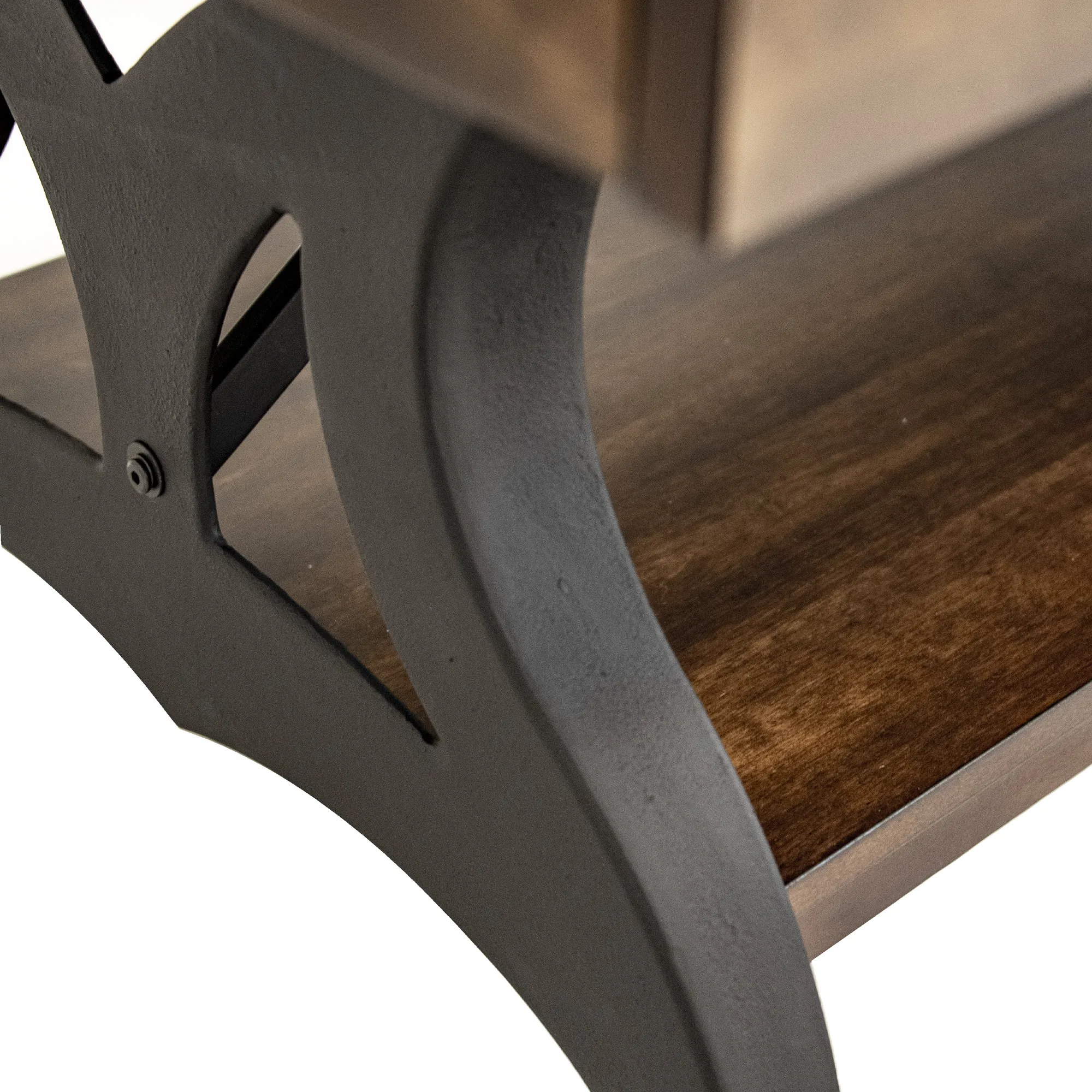 - Tables have wood shelves with metal trim