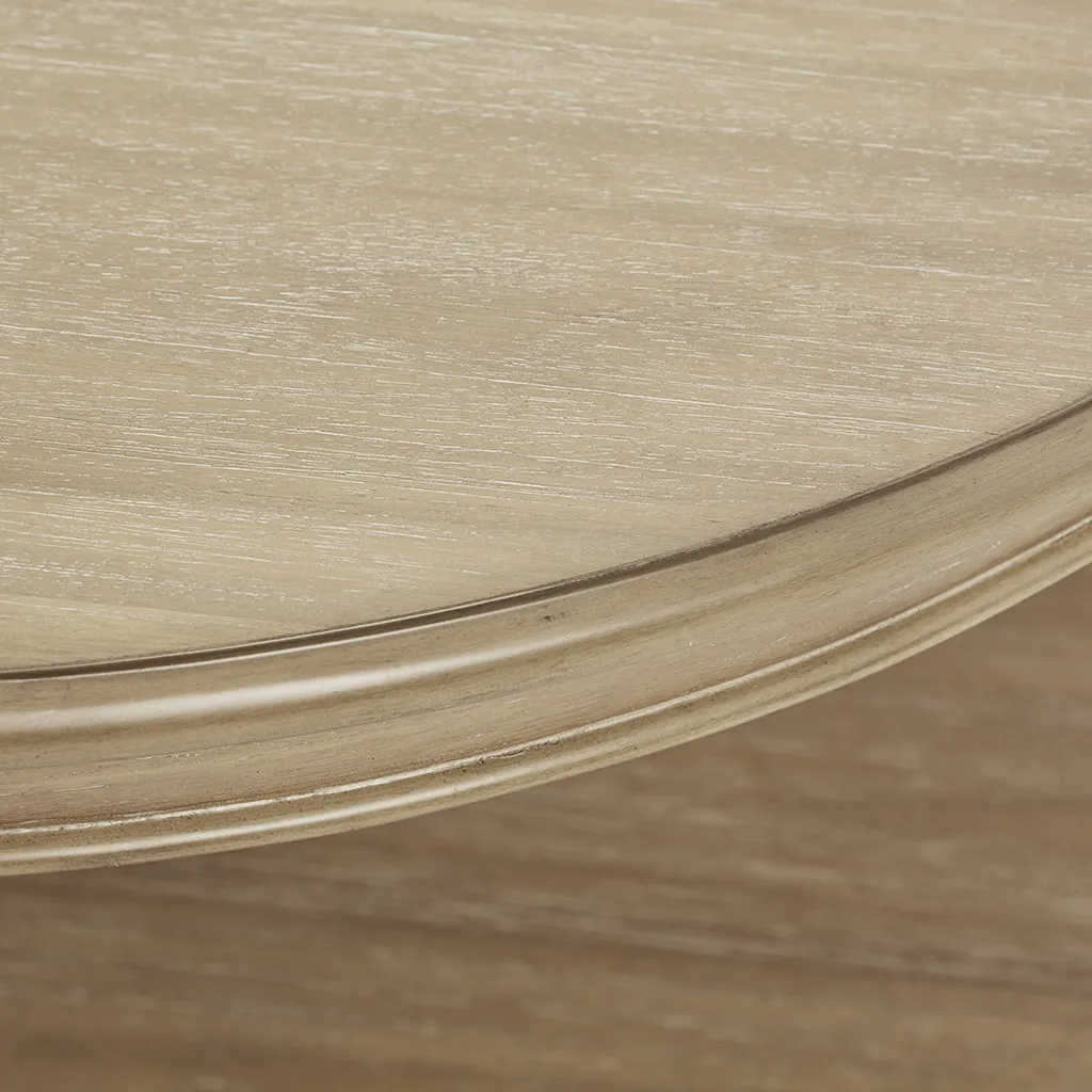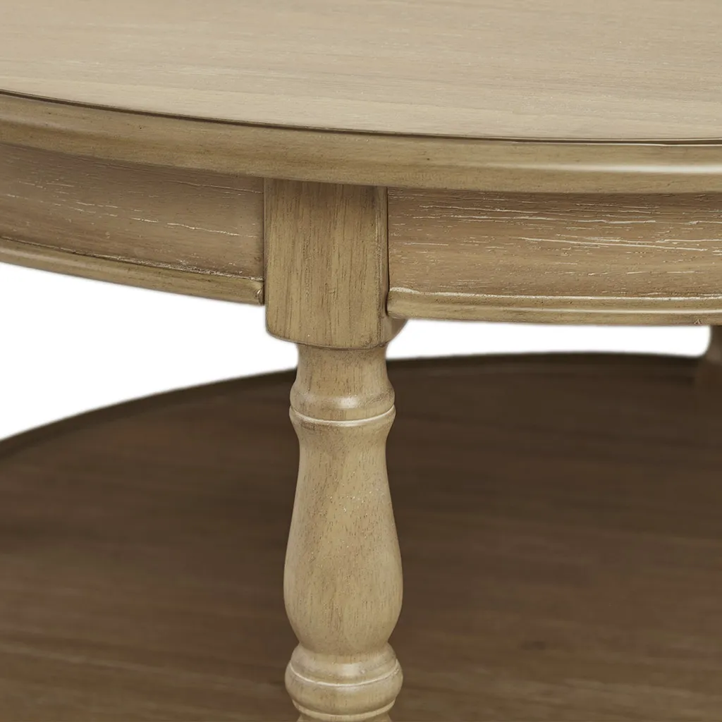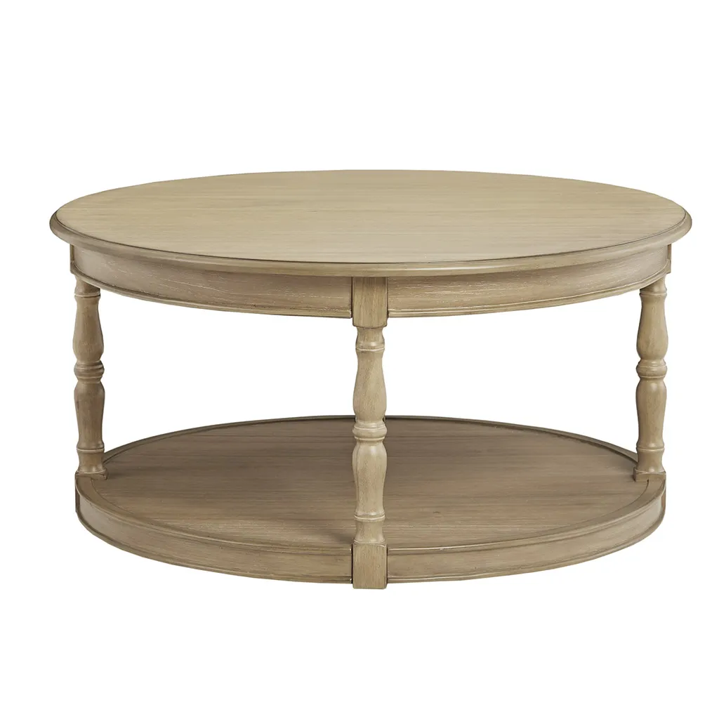 The Martha Stewart Belden Caster Coffee Table offers a charming farmhouse update to your living room. The round coffee table features a natural wood finish with solid wood turned legs that add an elegant touch to the country-inspired look. A lower shelf provides plenty of space to store or display your magazines and other essentials. Below the base and solid wood legs, casters help protect your floor and make this coffee table easy to move. Assembly is required and a tool is included.
