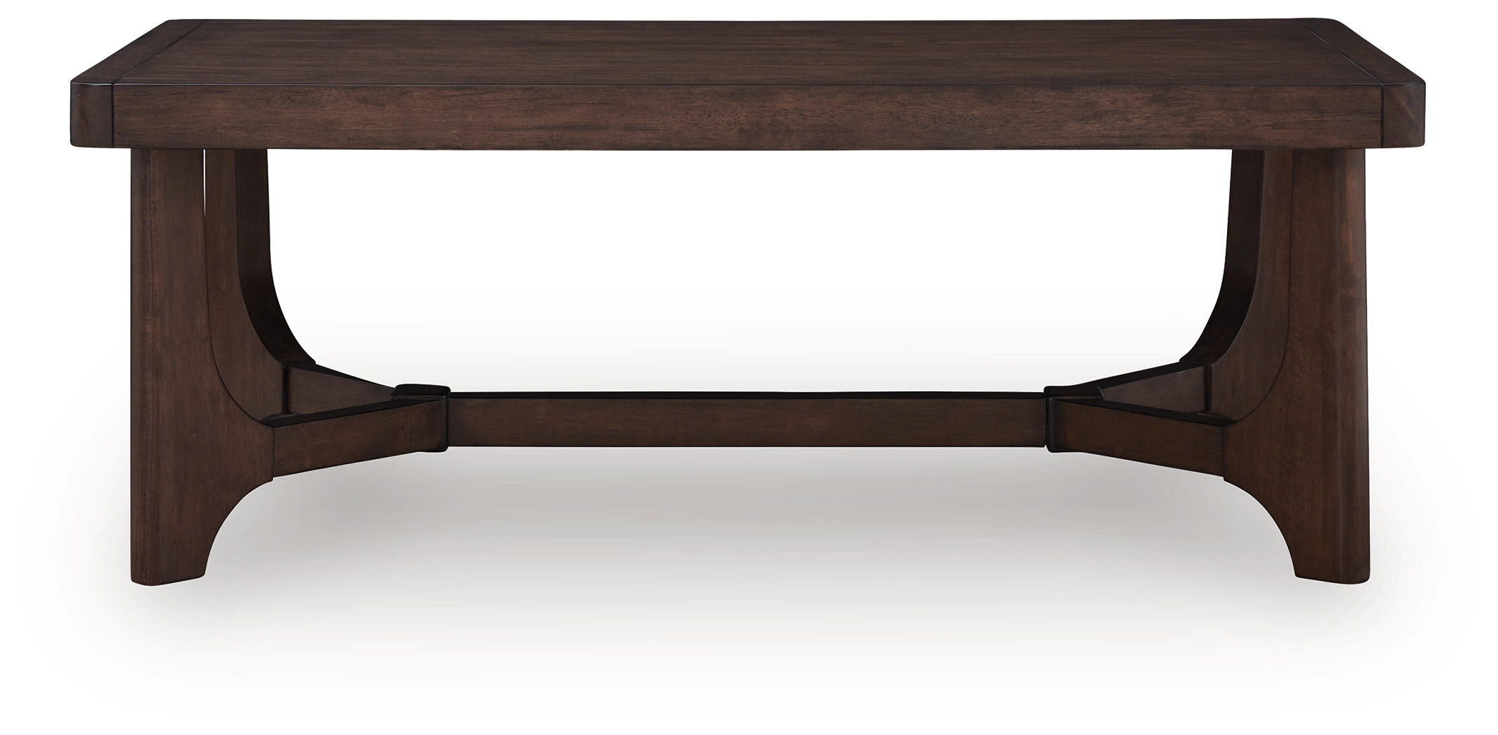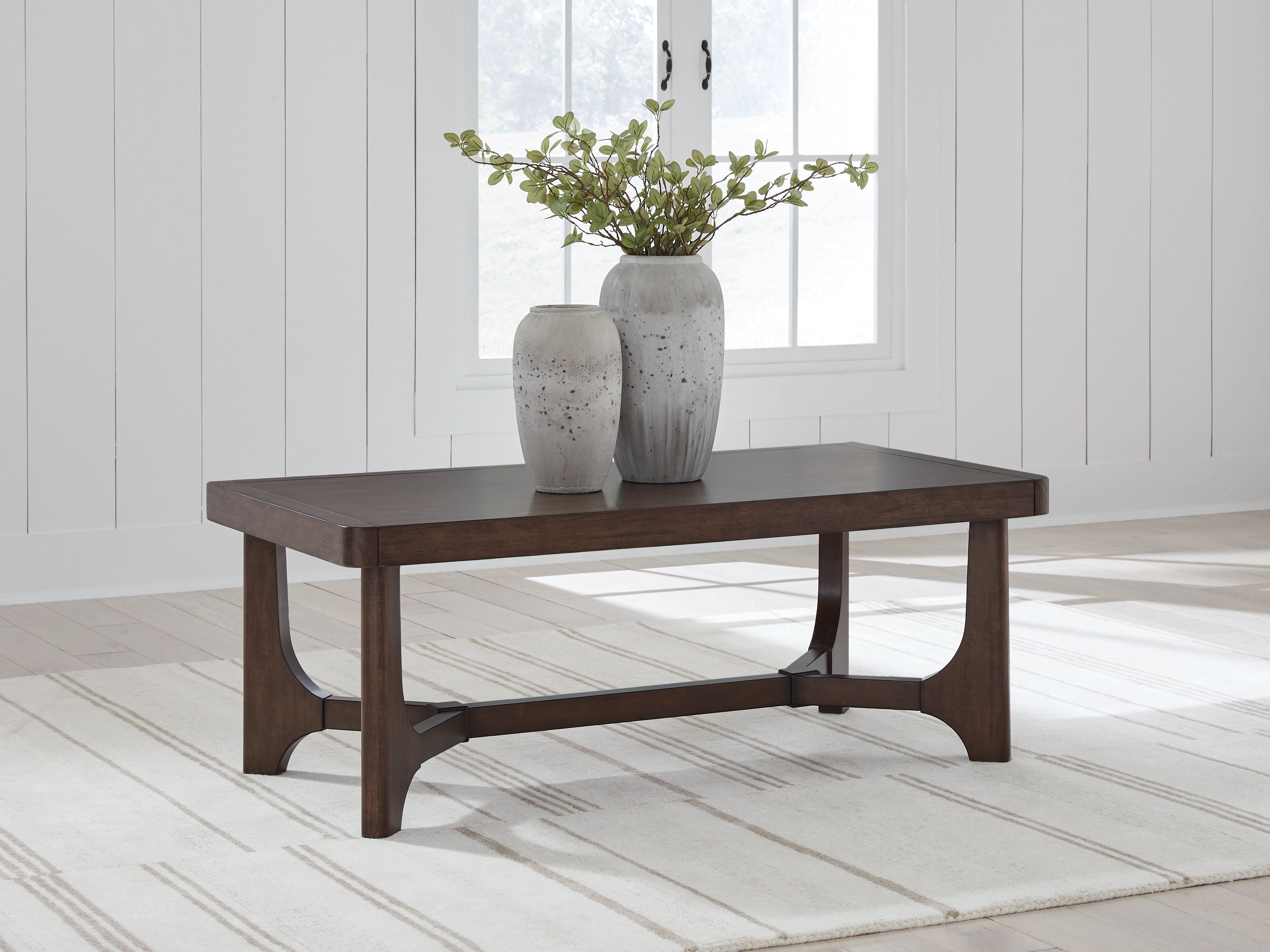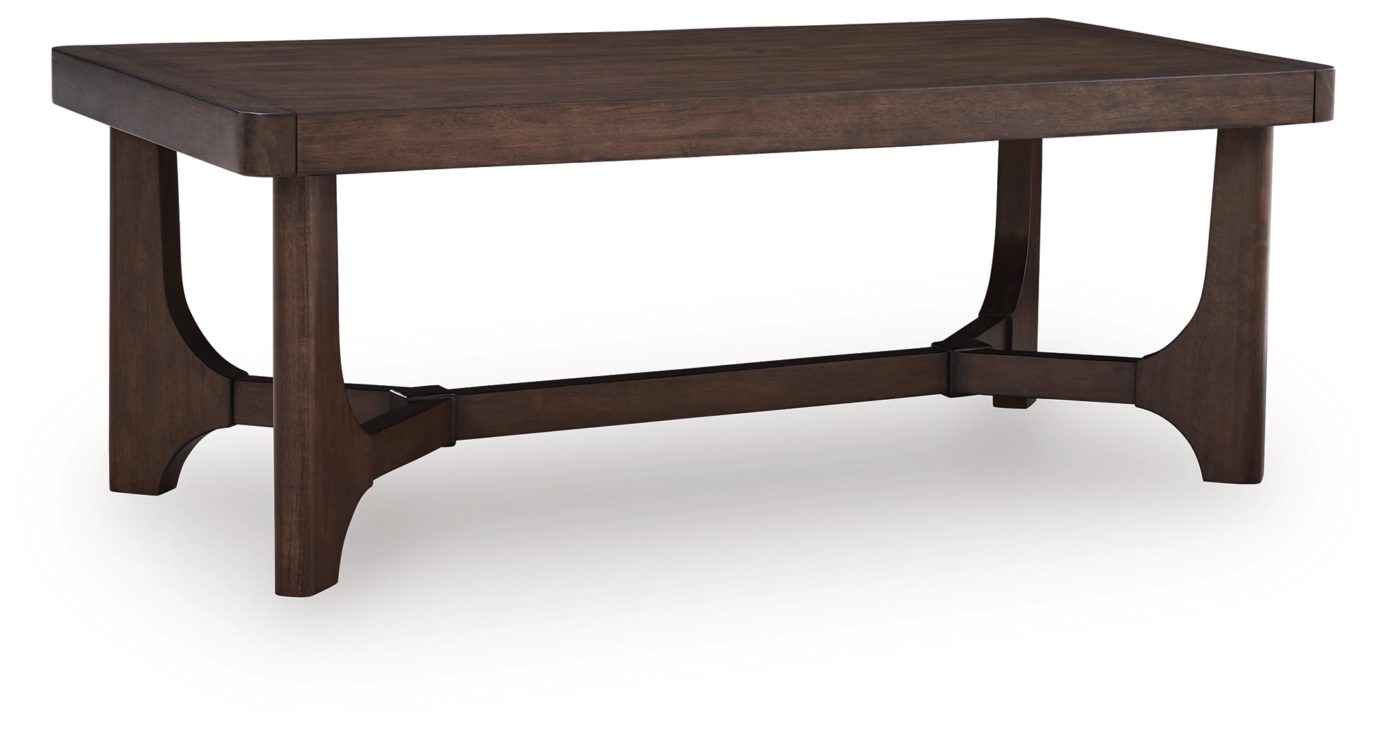 Master the art of casual contemporary design with this coffee table. Its softly rounded wood frame top pairs perfectly with an eye-catching double wishbone base and a rich brown finish for a decidedly here and now vibe. Talk about the ideal spot for drinks, decor and more.
