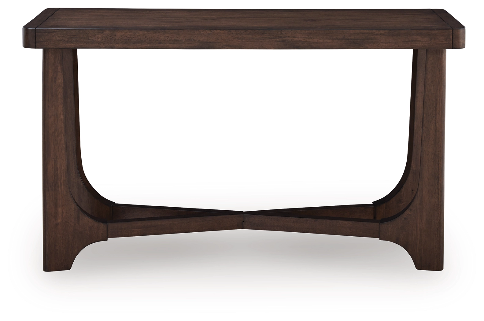 Master the art of casual contemporary design with the Korestone sofa table. Its softly rounded wood frame top pairs perfectly with an eye-catching double wishbone base and a rich brown finish for a decidedly here and now vibe. Talk about the ideal spot for decor, plants and more.