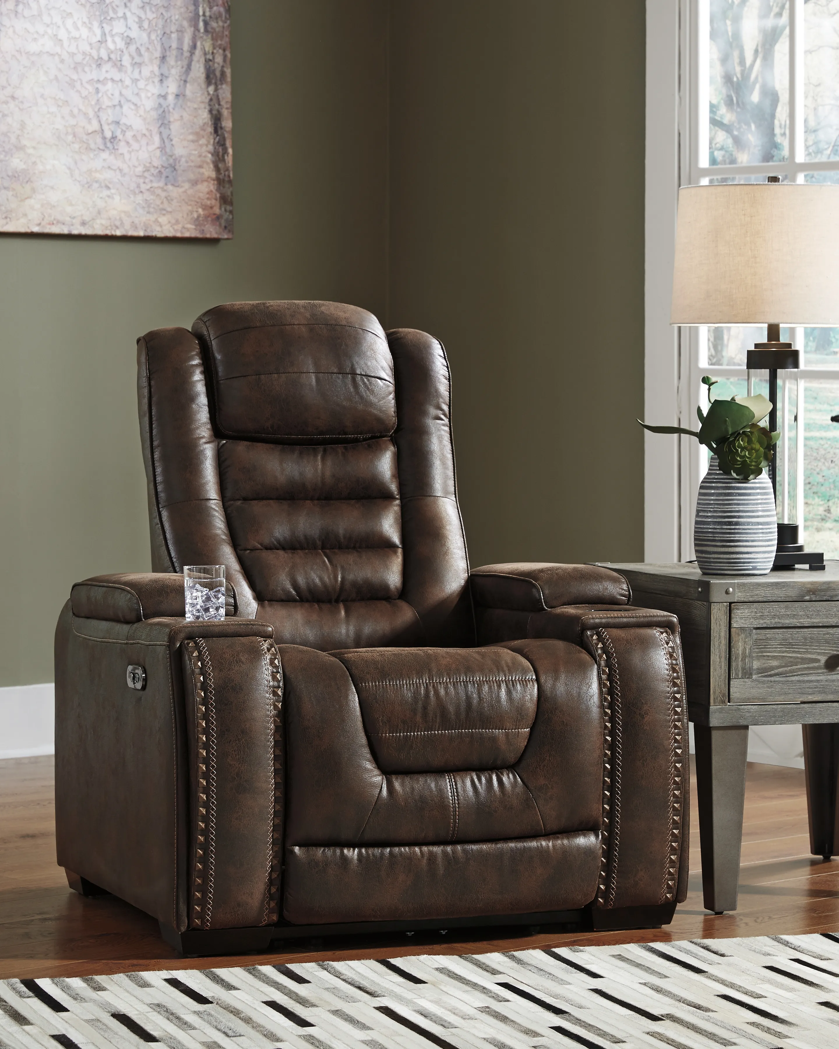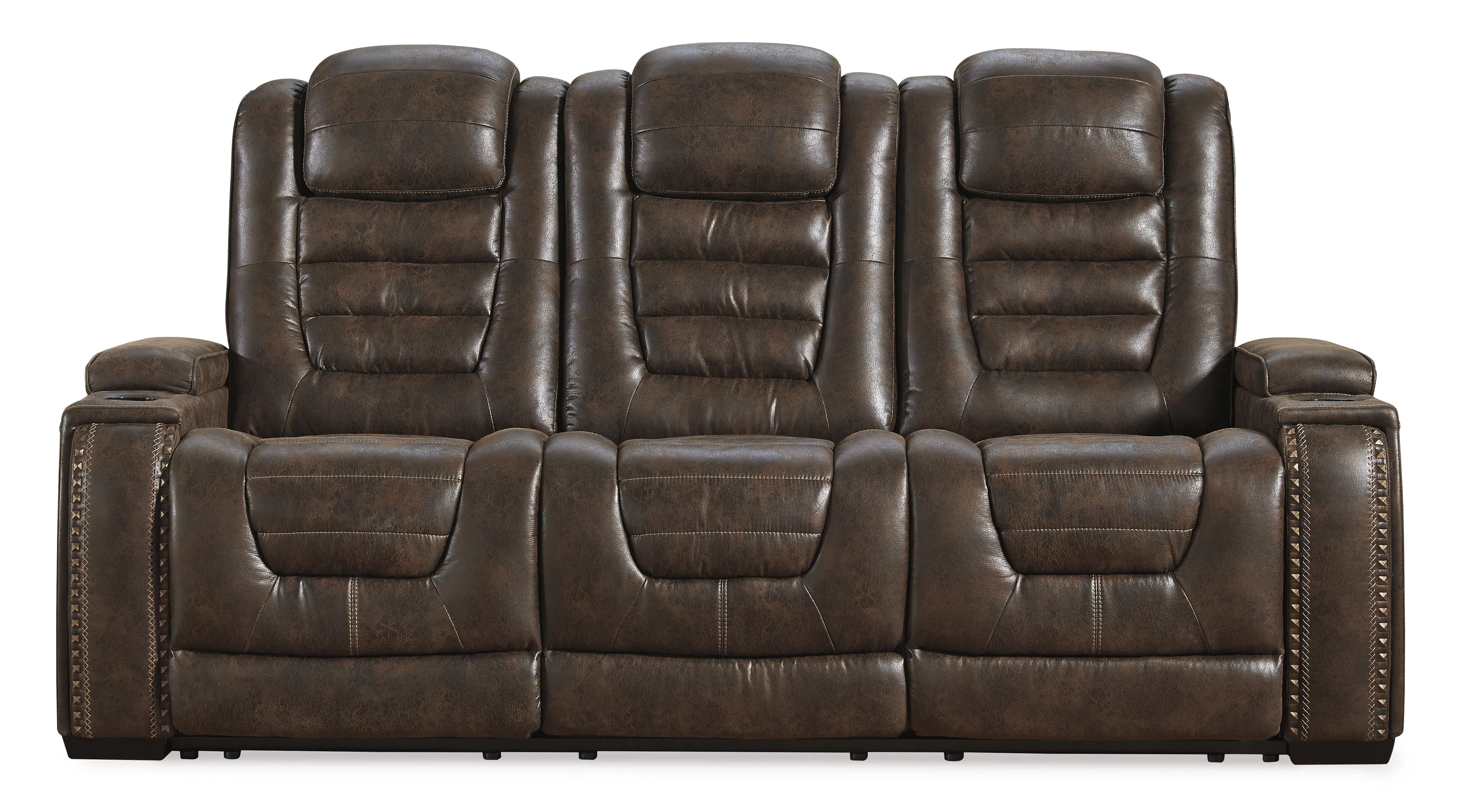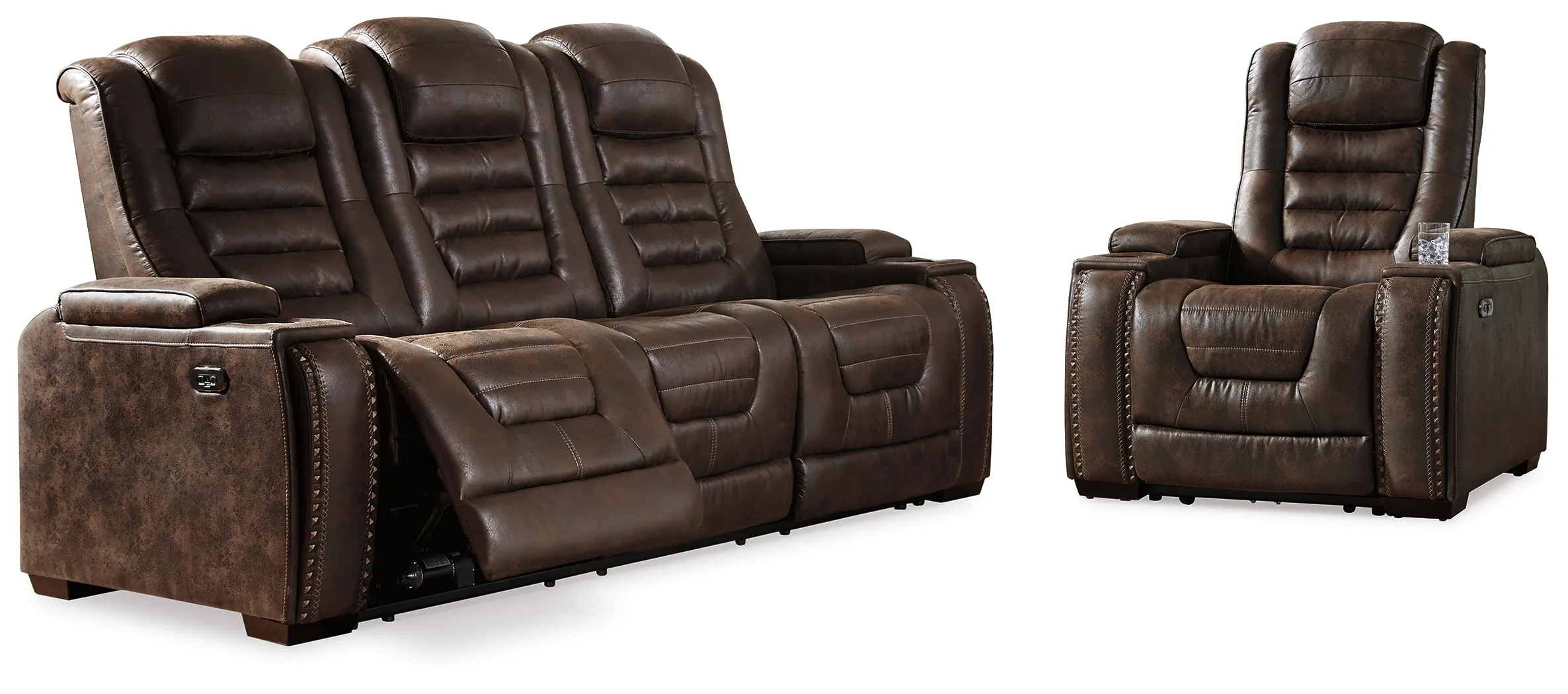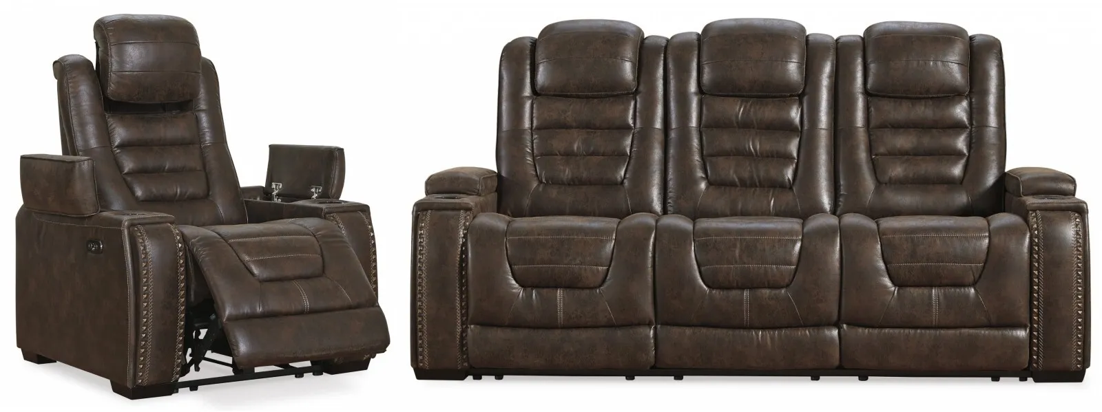 If you're looking for the perfect seating arrangement for gaming, lounging or just relaxing, look no further than the indulgent comfort of this power reclining sofa and recliner set. Sporting one-touch power controls, Easy View™ power adjustable headrests, cup holders, storage and chargers, these dual-sided reclining seats have everything you need for binge-watching or power playing. Padded cushions with waterfall back design and pillow top arms offer plenty of support, while leather alternative upholstery is given tuck and roll styling for a well-edited aesthetic.