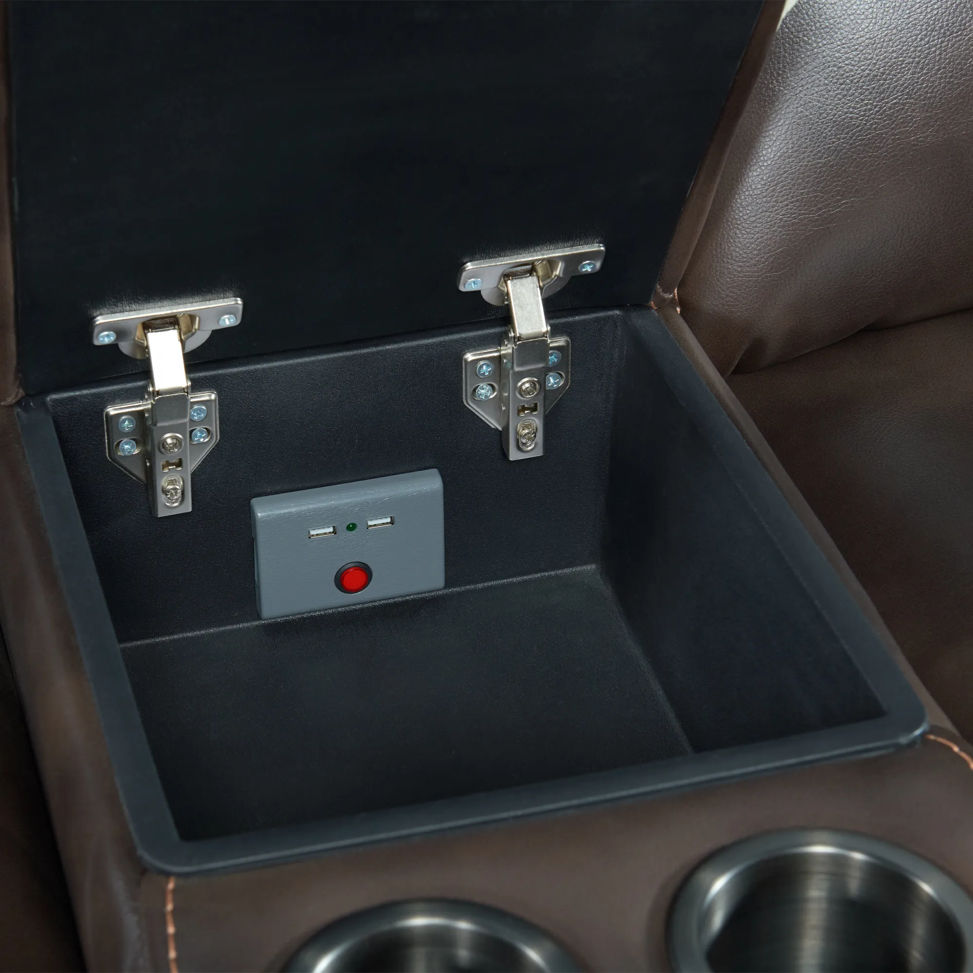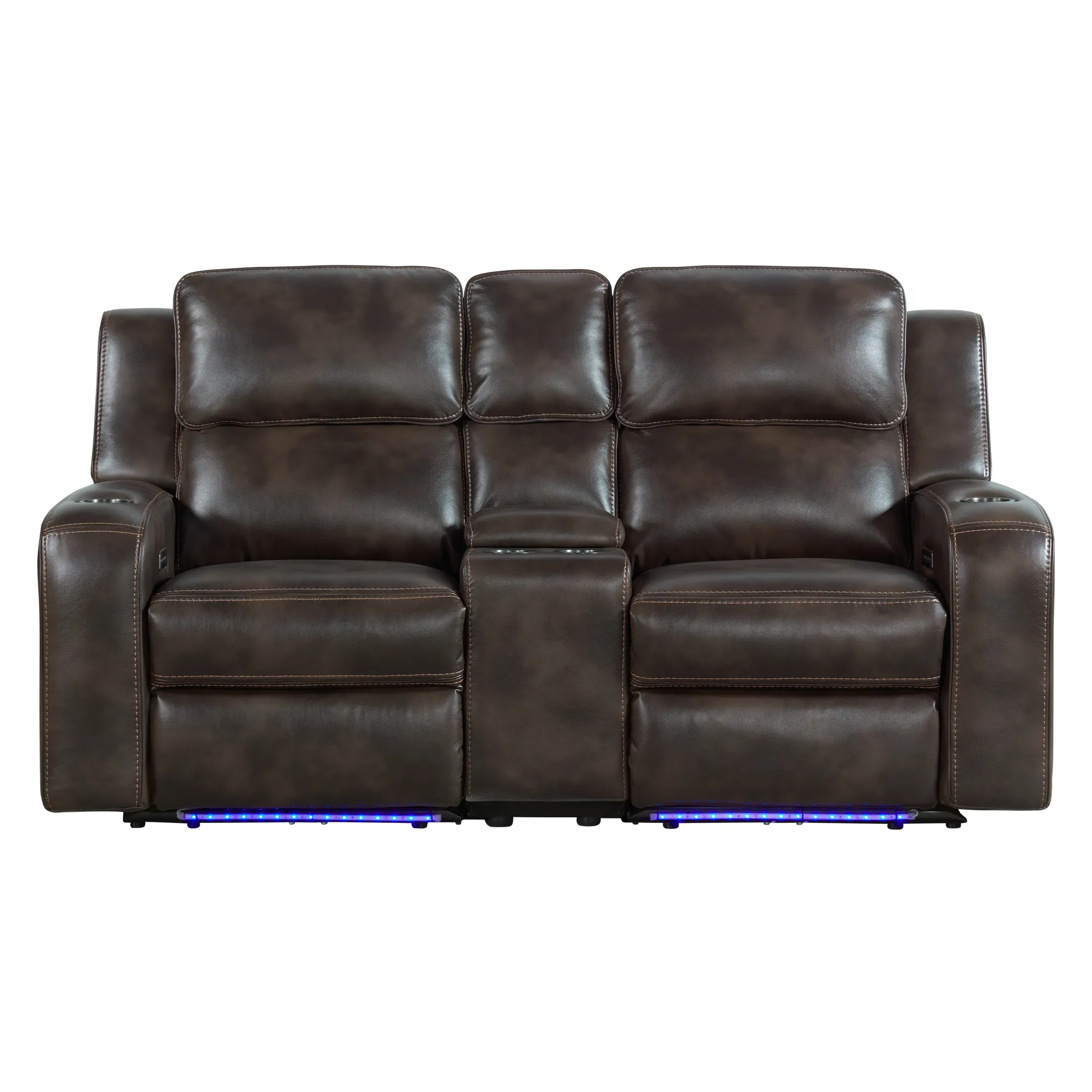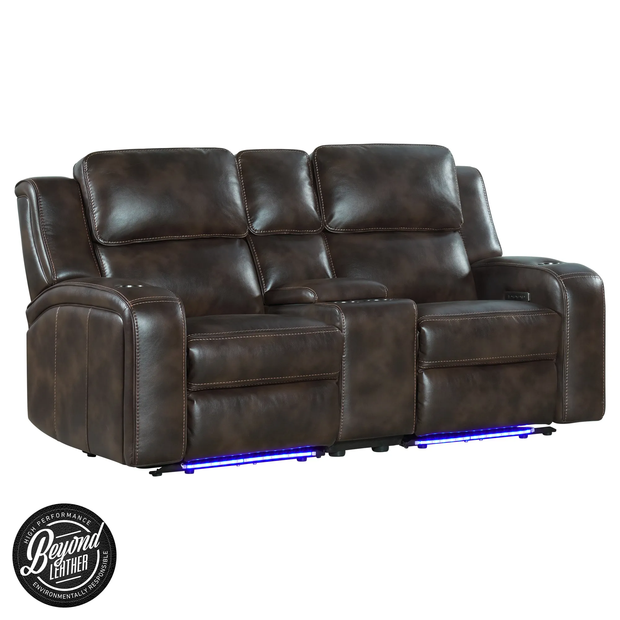 This is group is made for the modern family. The generous over padded track arm design, features a pub back and chaise seating. The groups comfort is enhanced by the power recline and power headrest. This group also features a few extra surprises! A drop-down table, two cup holders, floor lights, and charging stations. This group is featured in a polyurethane cover that has the look and feel of leather. Construction is engineered plywood frame with padding completely on outside arms and back and metal seat box construction.