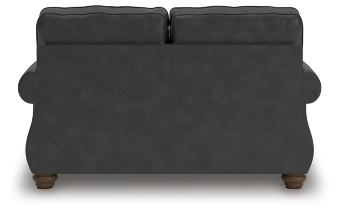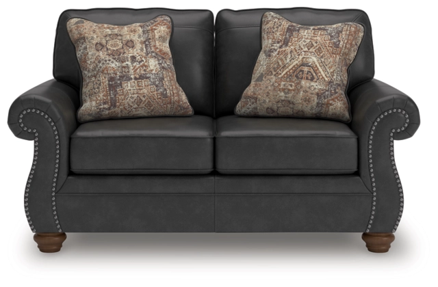 Everyone can have the best seat in the house with this loveseat. Its nailhead trim puts the finishing touches on the traditional roll arms you love. Comfy, durable cushions—wrapped in a rustic yet sophisticated faux leather—keep you feeling relaxed. Chenille pillows in a distressed motif pattern add another layer of comfort. And the loveseat's turned legs show that style and quality flow from top to bottom.