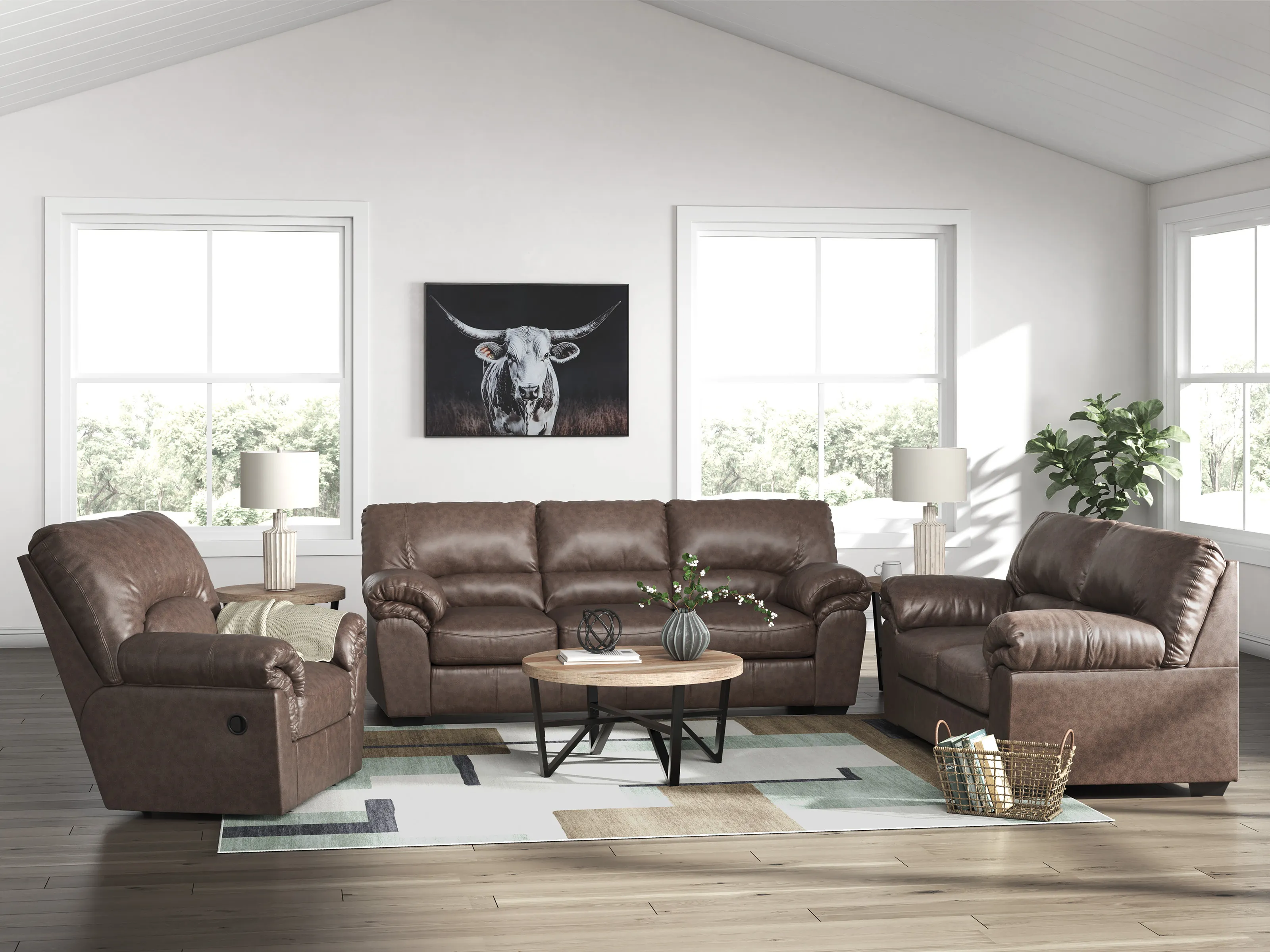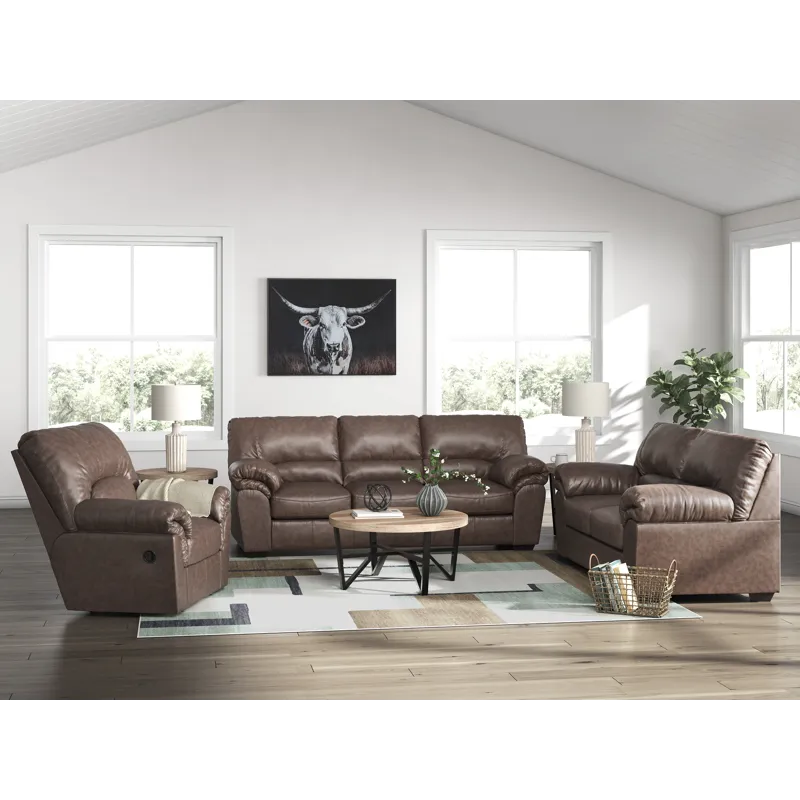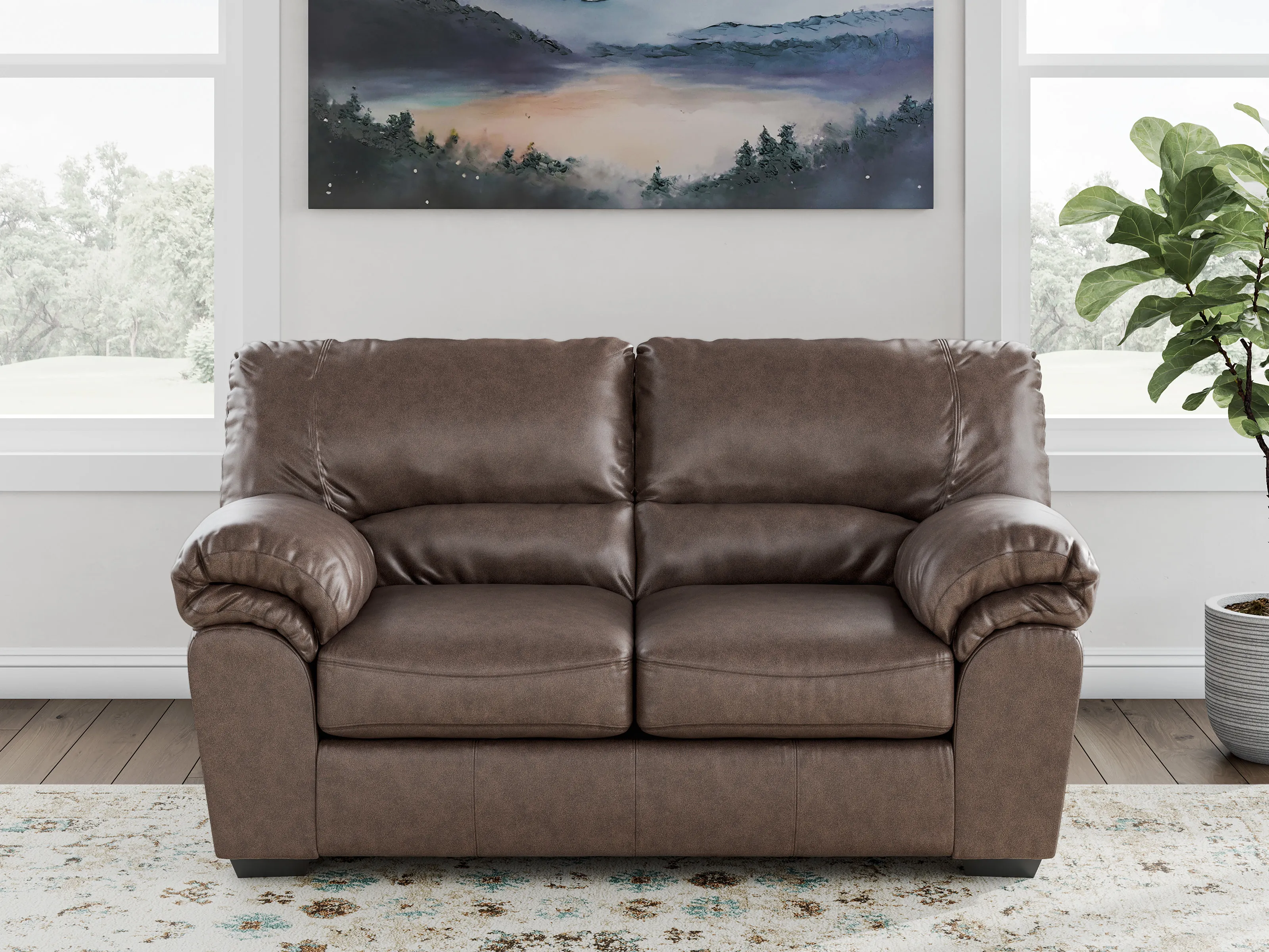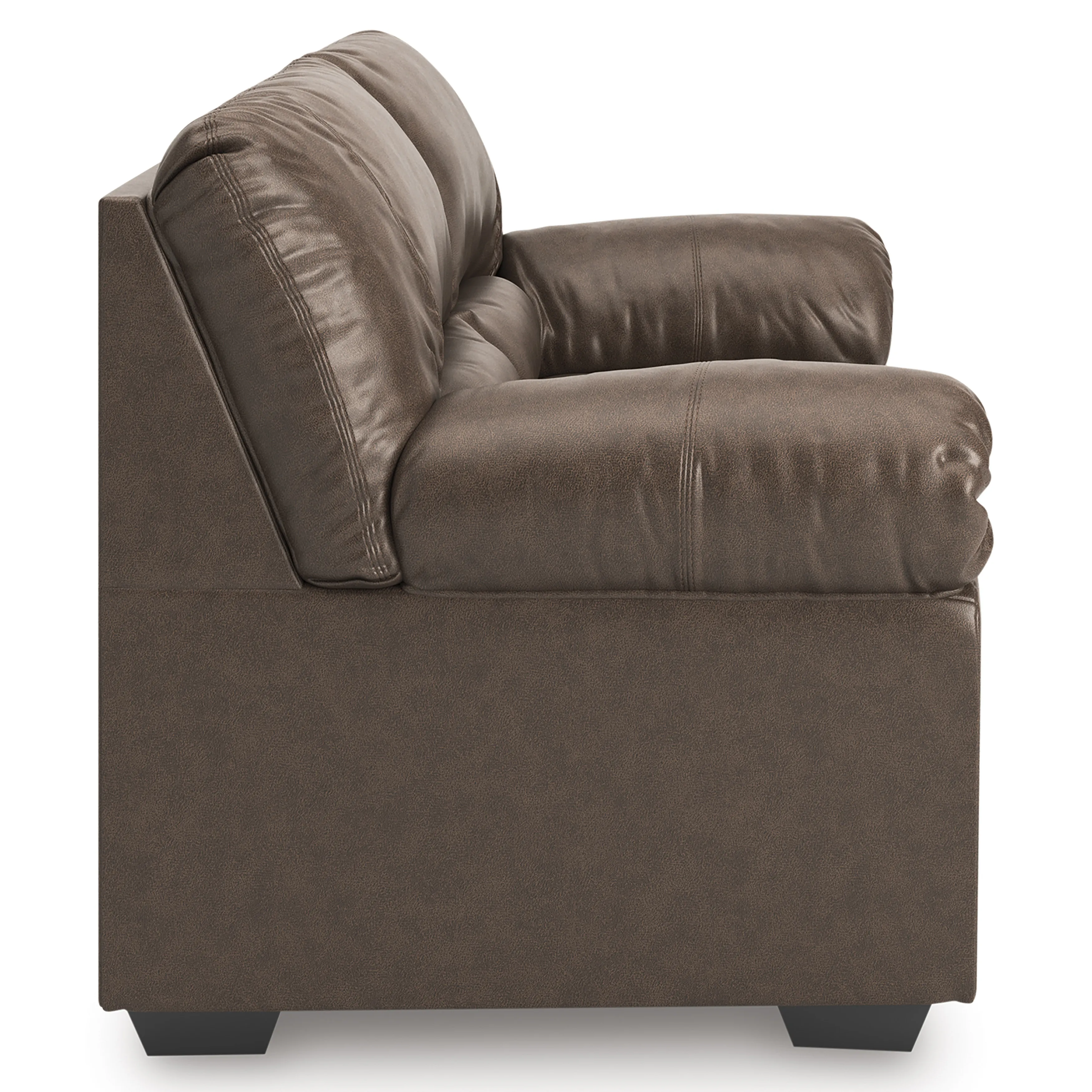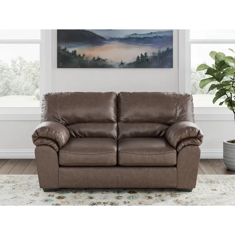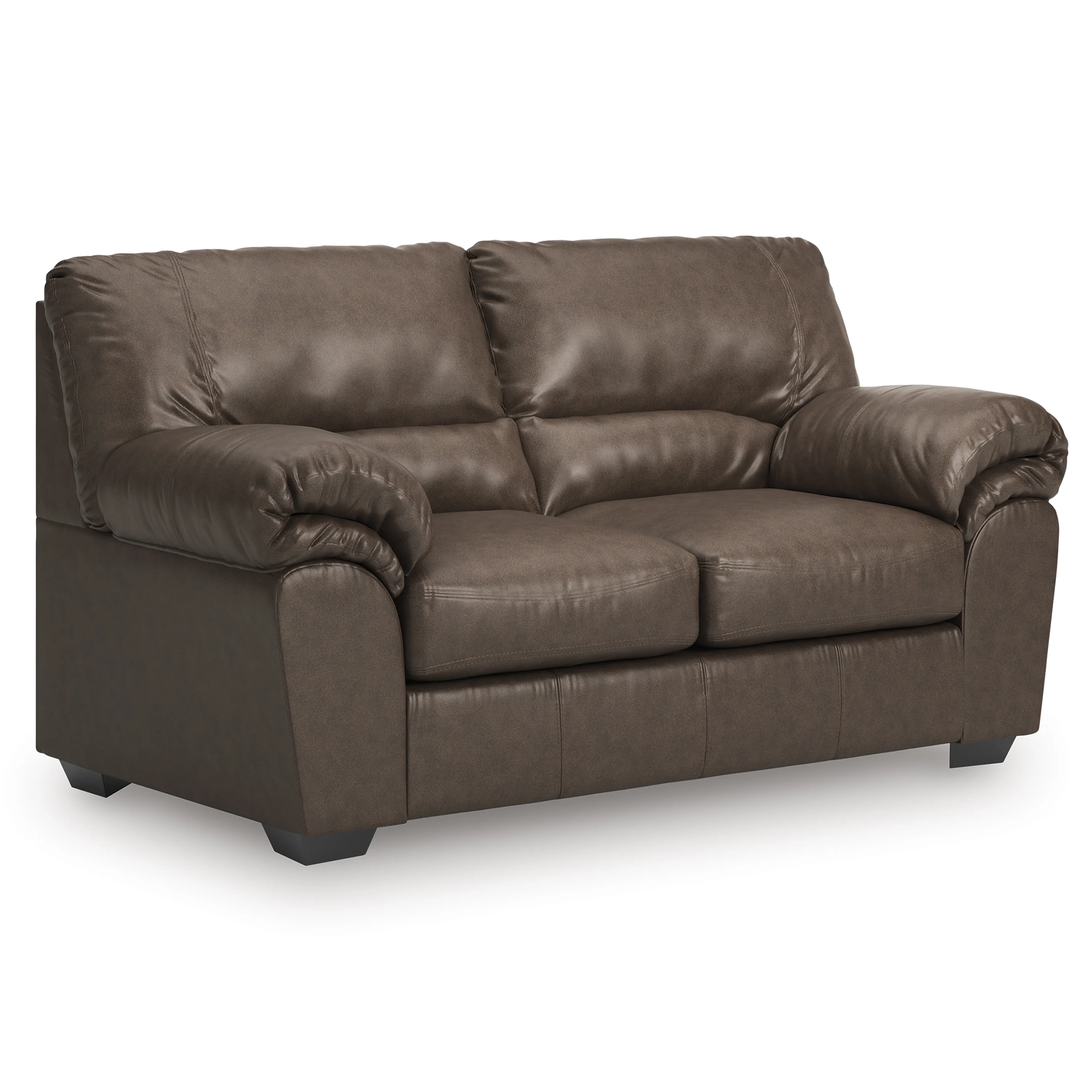 Modern comfort never looked so good. Sporting supremely soft yet durable cushions accented with high-fashion jumbo stitching, this stunning loveseat is the ultimate choice in comfortably cool, contemporary style. Its umber-hued faux leather indulges with an upscale feel and wows like the real thing.