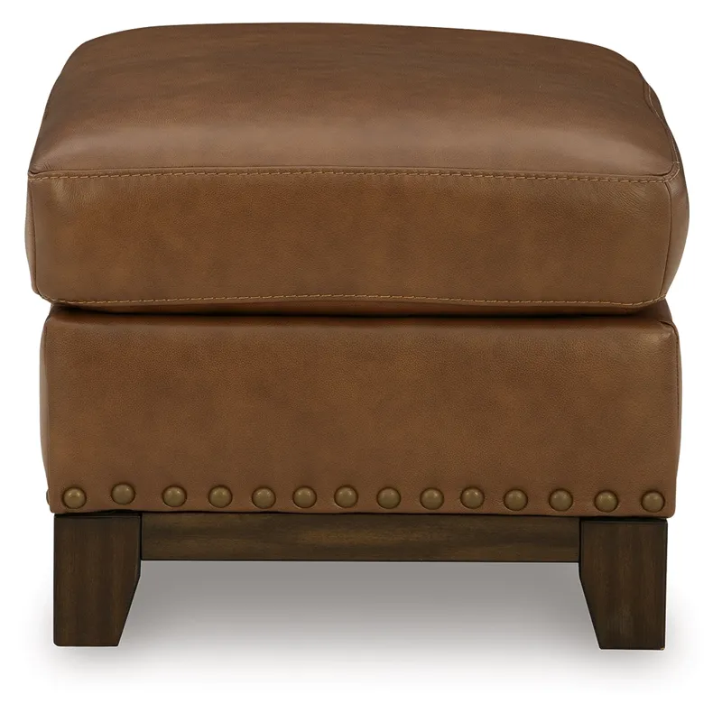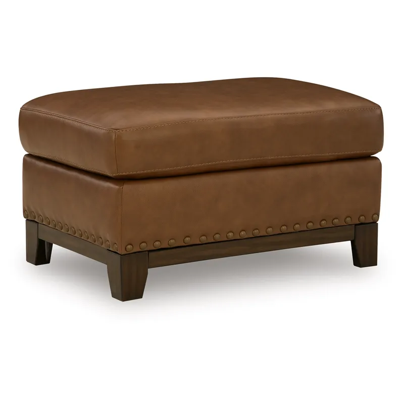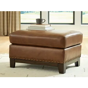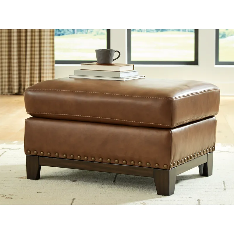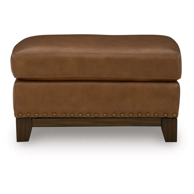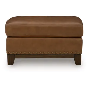 Effortlessly blending contemporary and classic elements for a truly timeless look, this ottoman offers a fresh take on transitional style. Its robust silhouette is coupled with skillfully matched leather and faux leather upholstery, while nailhead trim offers a touch of subtle sophistication. A pleasingly plump cushion with jumbo stitching provides exceptional comfort. We’re all in—how about you?