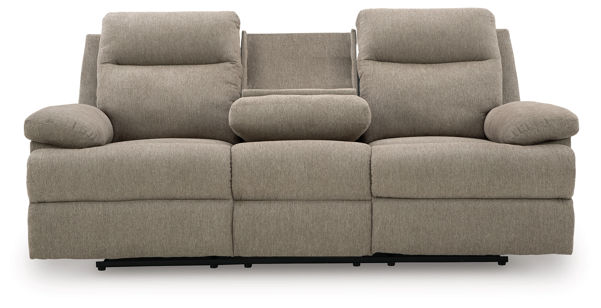 Fully upright or completely stretched out, this traditional-inspired reclining sofa caters to the art of relaxation. Super soft mocha-colored upholstery and sumptuous cushioning—made all the more indulgent with pillow top arms—cradles you in comfort from head to toe. A middle seat with a drop-down table, cup holders and USB charging takes comfort and convenience to another level.