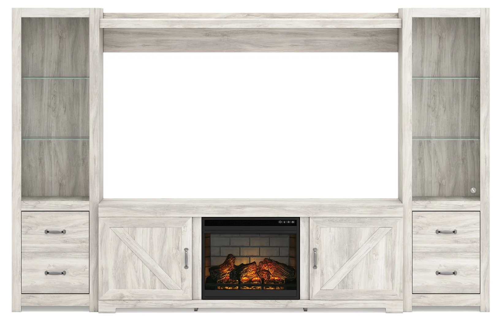Express your farmhouse style with this entertainment center. Its wispy white finish over replicated oak wood grain is a delightful change from the ordinary. Clean-lined, classic styling with barn door inspiration provides a country chic aesthetic that’s a breath of fresh air. Its combination of cabinet storage and open display space with LED lighting makes for just the right mix. What really turns up the heat: an electric infrared fireplace insert with faux firebrick surround that operates with or without infrared heat and includes a multi flame feature, 7-level temperature setting, five brightness levels and LED glowing embers.
