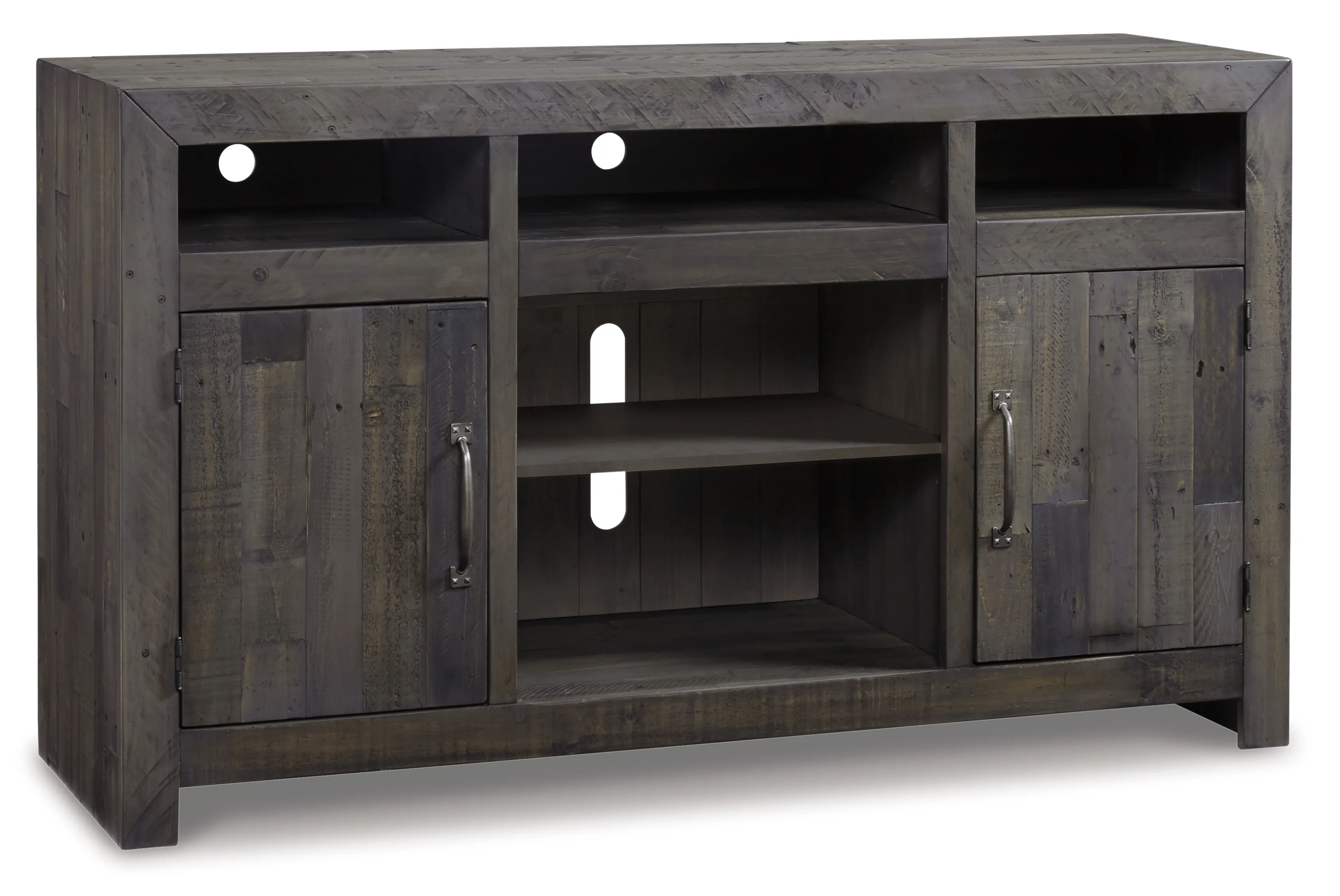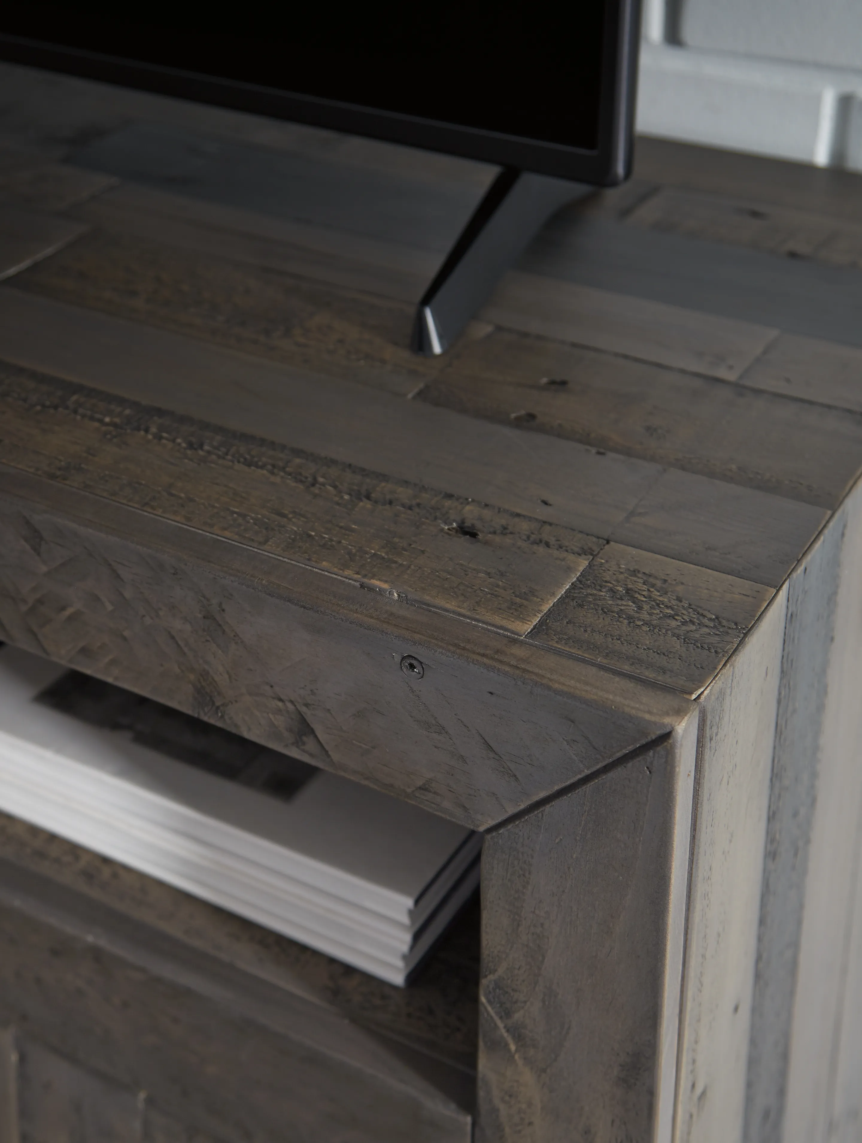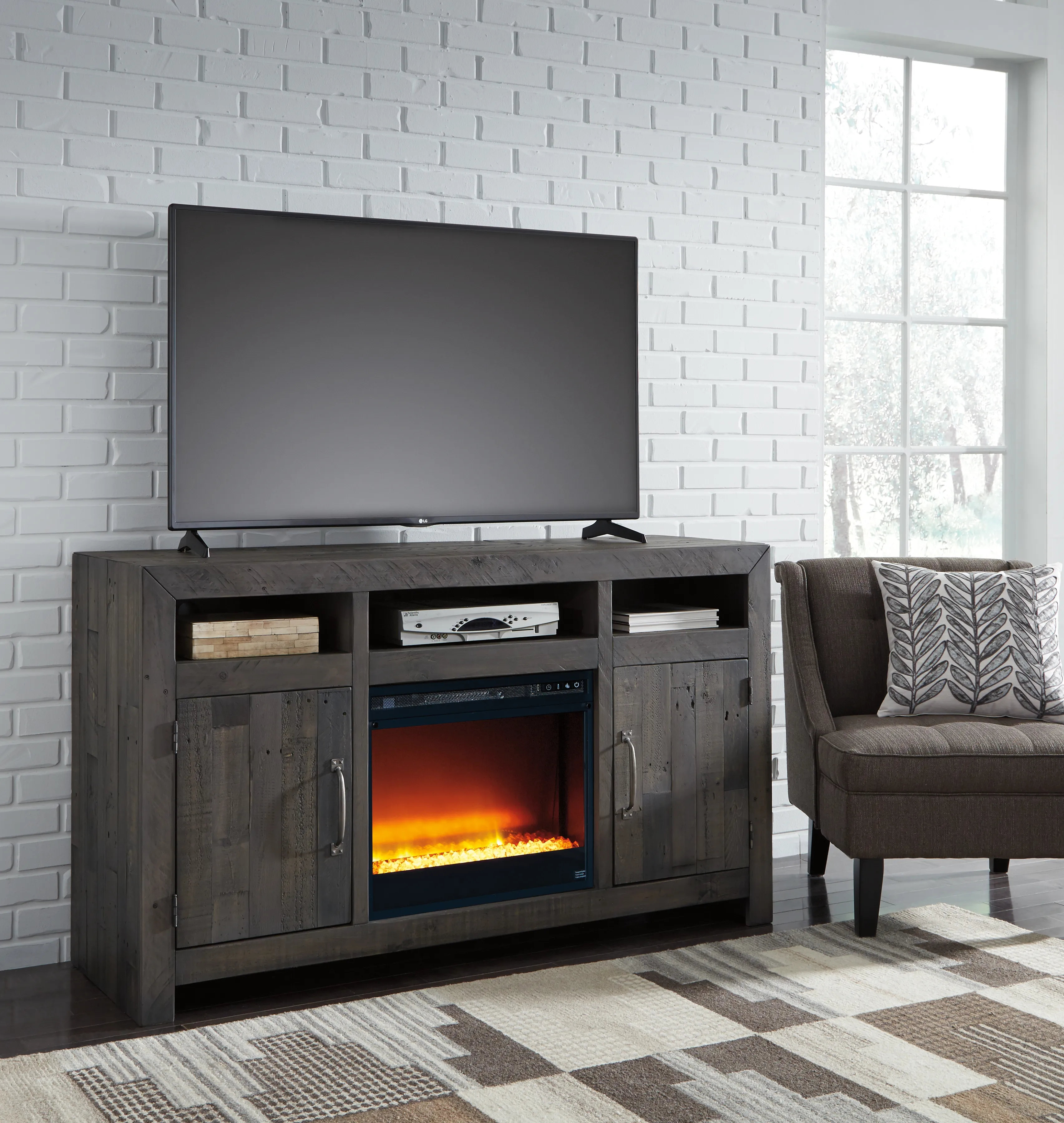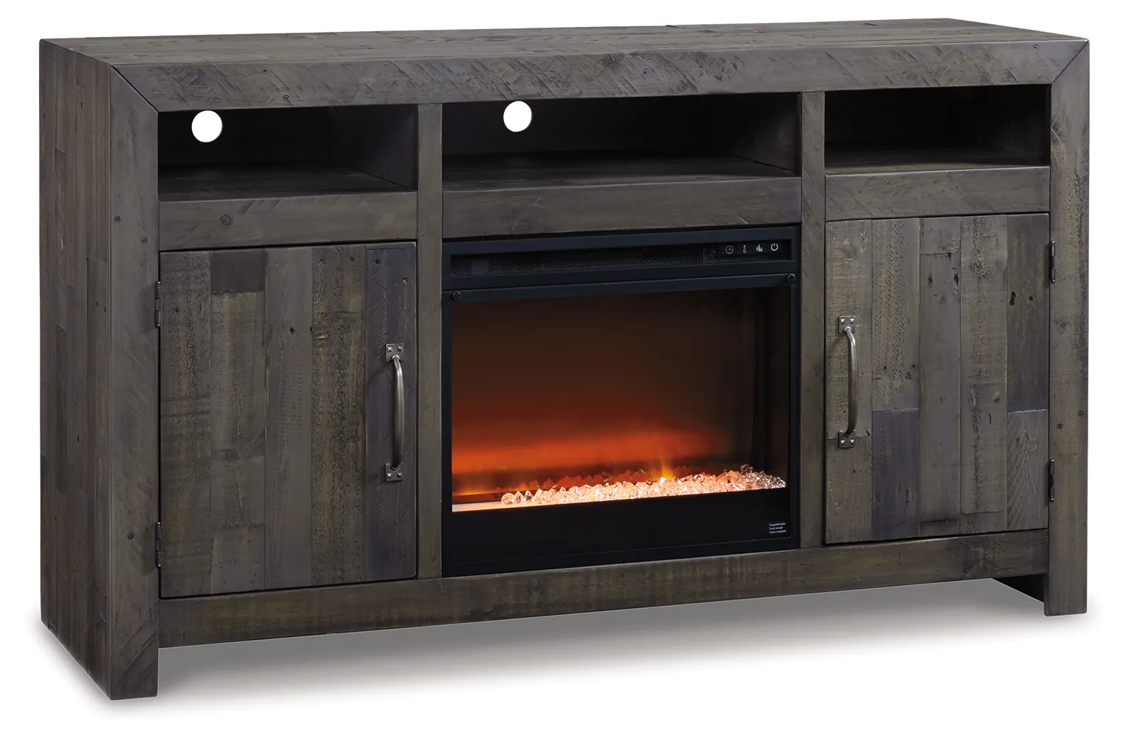 This TV stand with fireplace makes what's old, what's new. Serving up a fresh look in urban farmhouse style, it's crafted with reclaimed pine wood loaded with nail holes, nicks, gouges and grooves-marks of "imperfection" for all the more authentic beauty. Offset plank effect and a weathered charcoal gray finish give the ultra-linear profile a casually cool sensibility. Adding that much more show-stopping style: an LED fireplace insert that operates with or without heat and includes a six-level temperature setting, remote control and overheating control for added safety. The fireplace insert comes with optional faux glass crystals and natural stones, so you can customize the look of the flame bed.