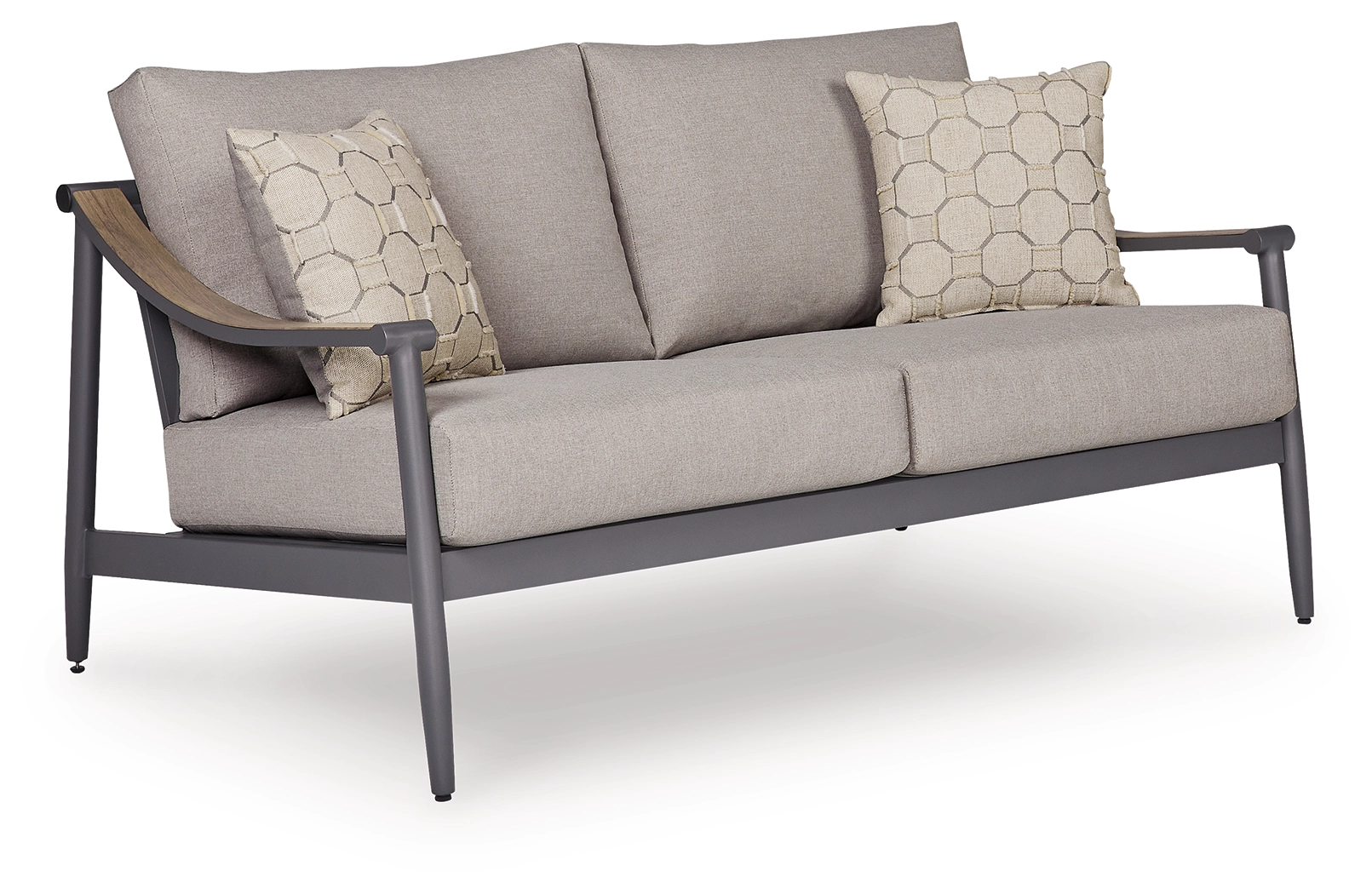 A refined marriage of style and durability, this outdoor loveseat adds contemporary flair to your porch or patio. Wood tones and shades of gray lend a versatile, neutral appeal. And this loveseat is built to last, thanks to its rust-resistant frame and cleanable, UV-resistant fabric.